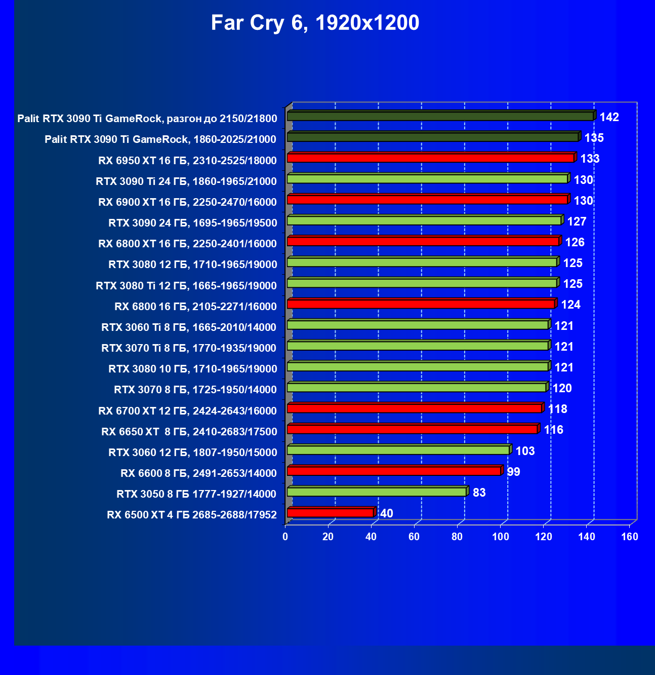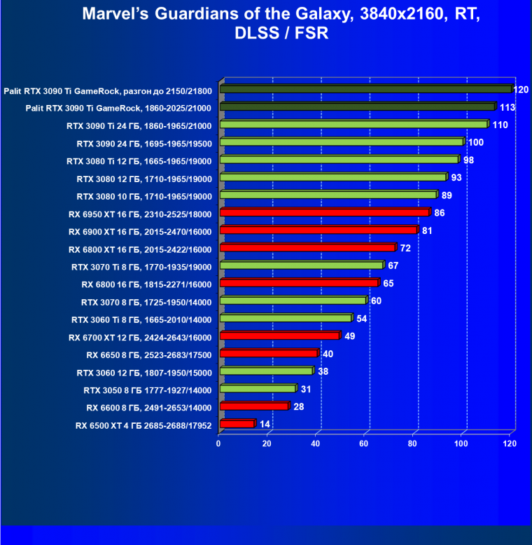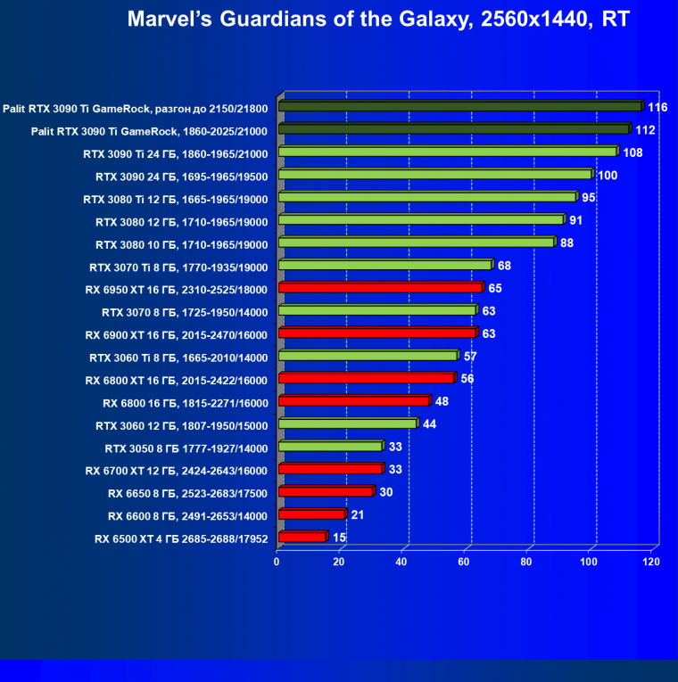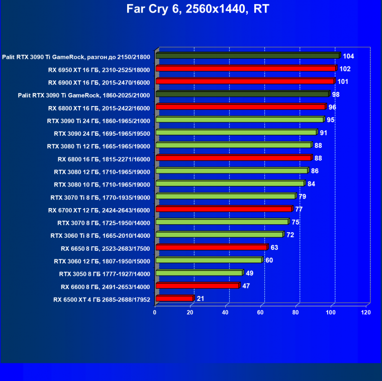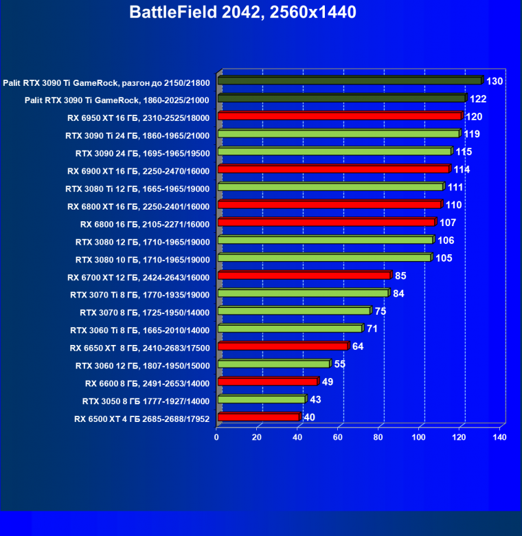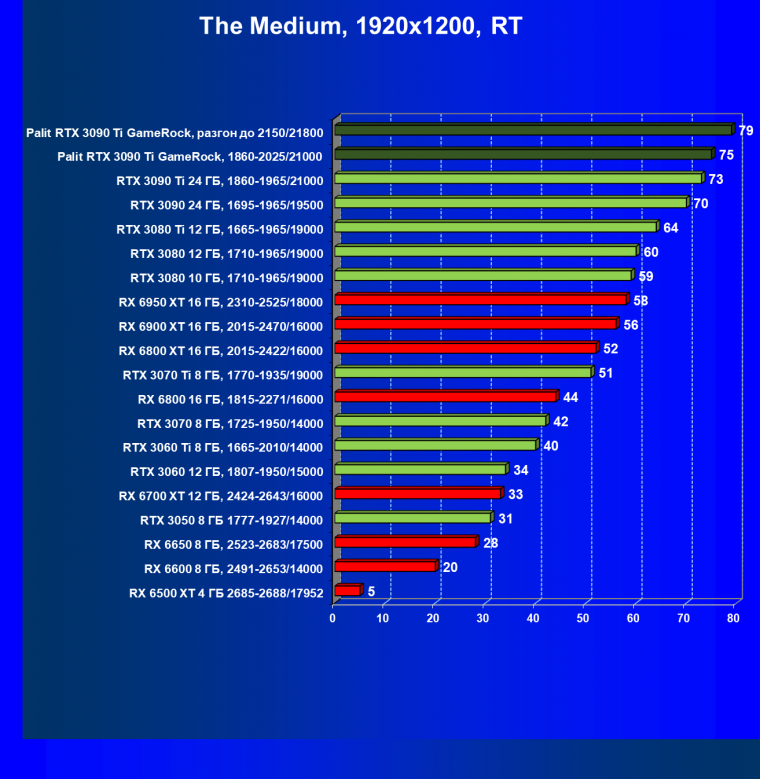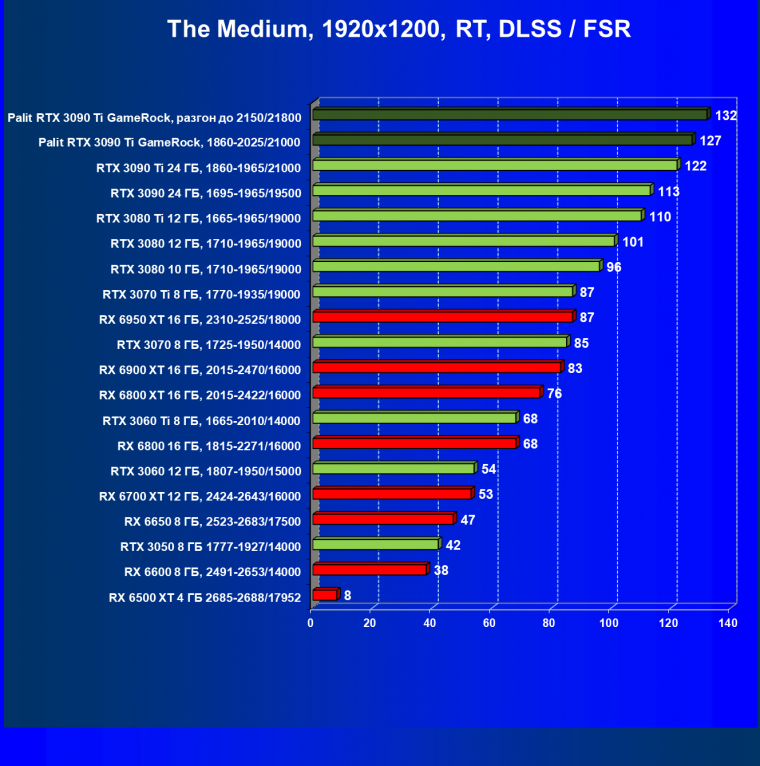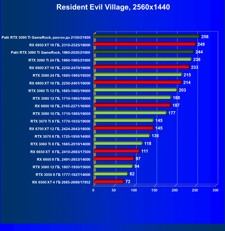 Как ранее мы уже отмечали: лидер есть лидер во всех отношениях, причем повышенные частоты работы карты позволили ей обойти флагмана AMD — Radeon RX 6950 XT.