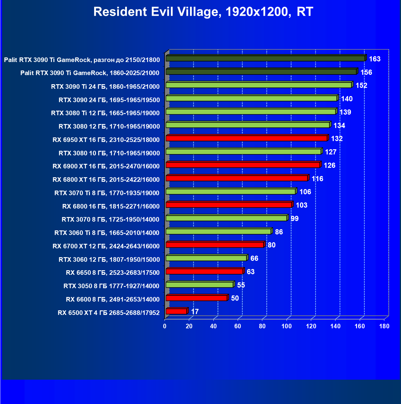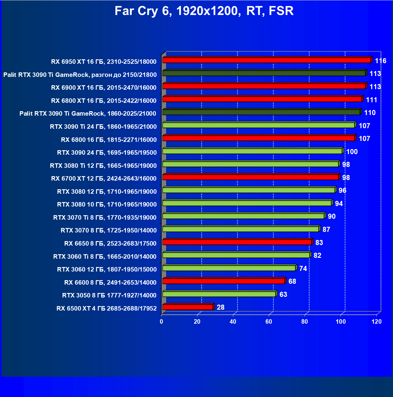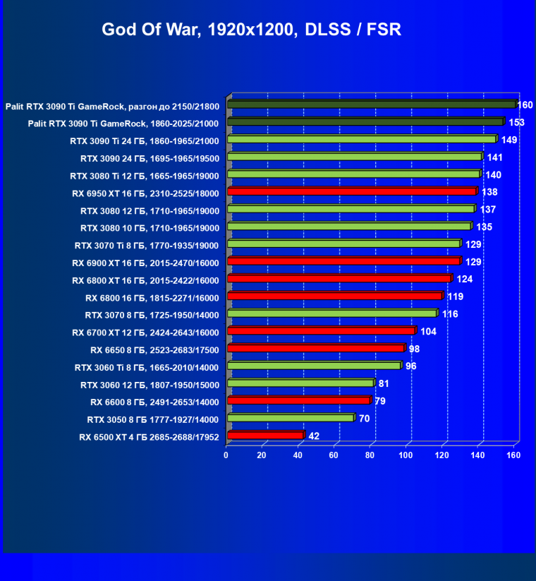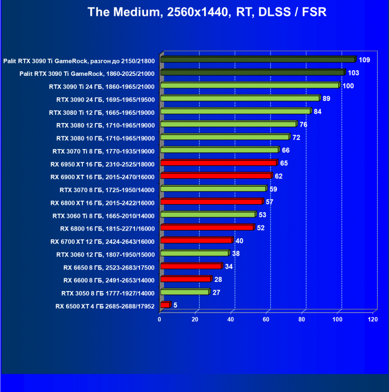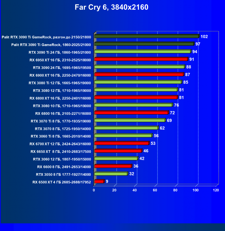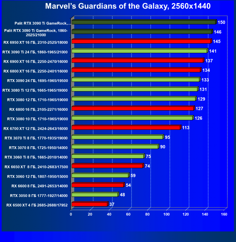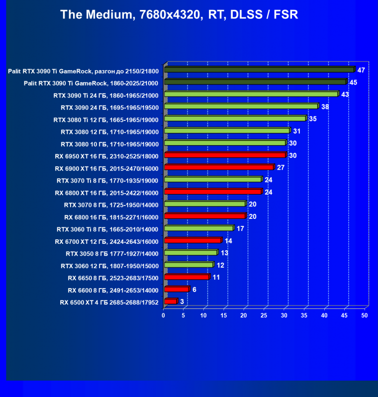 Как ранее мы уже отмечали: лидер есть лидер во всех отношениях, причем повышенные частоты работы карты позволили ей обойти флагмана AMD — Radeon RX 6950 XT.