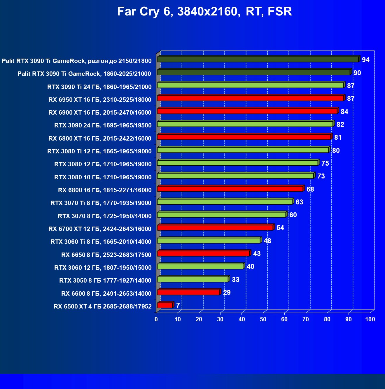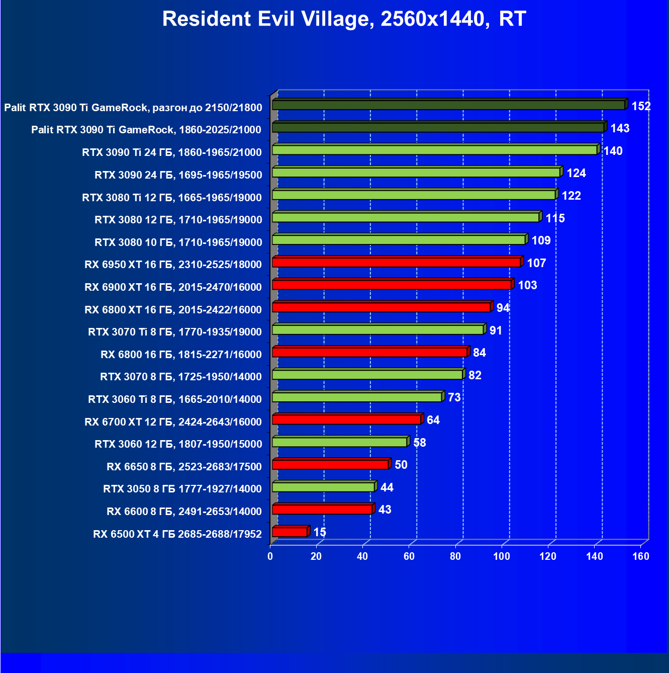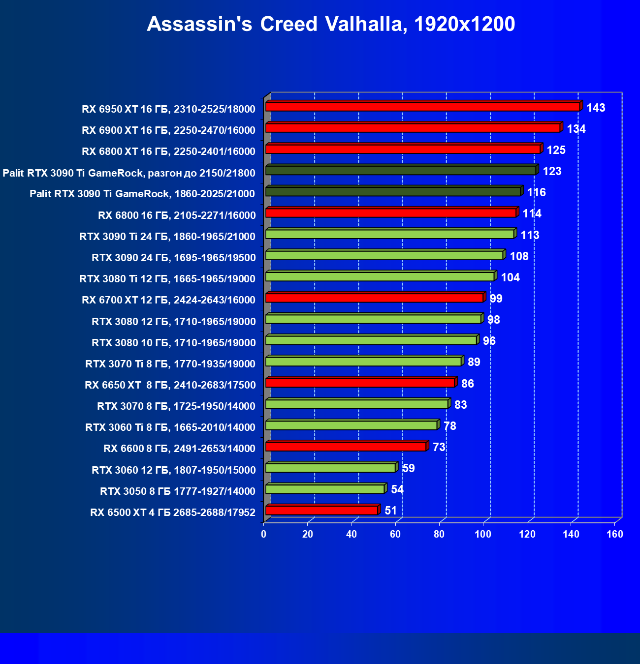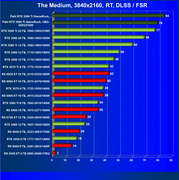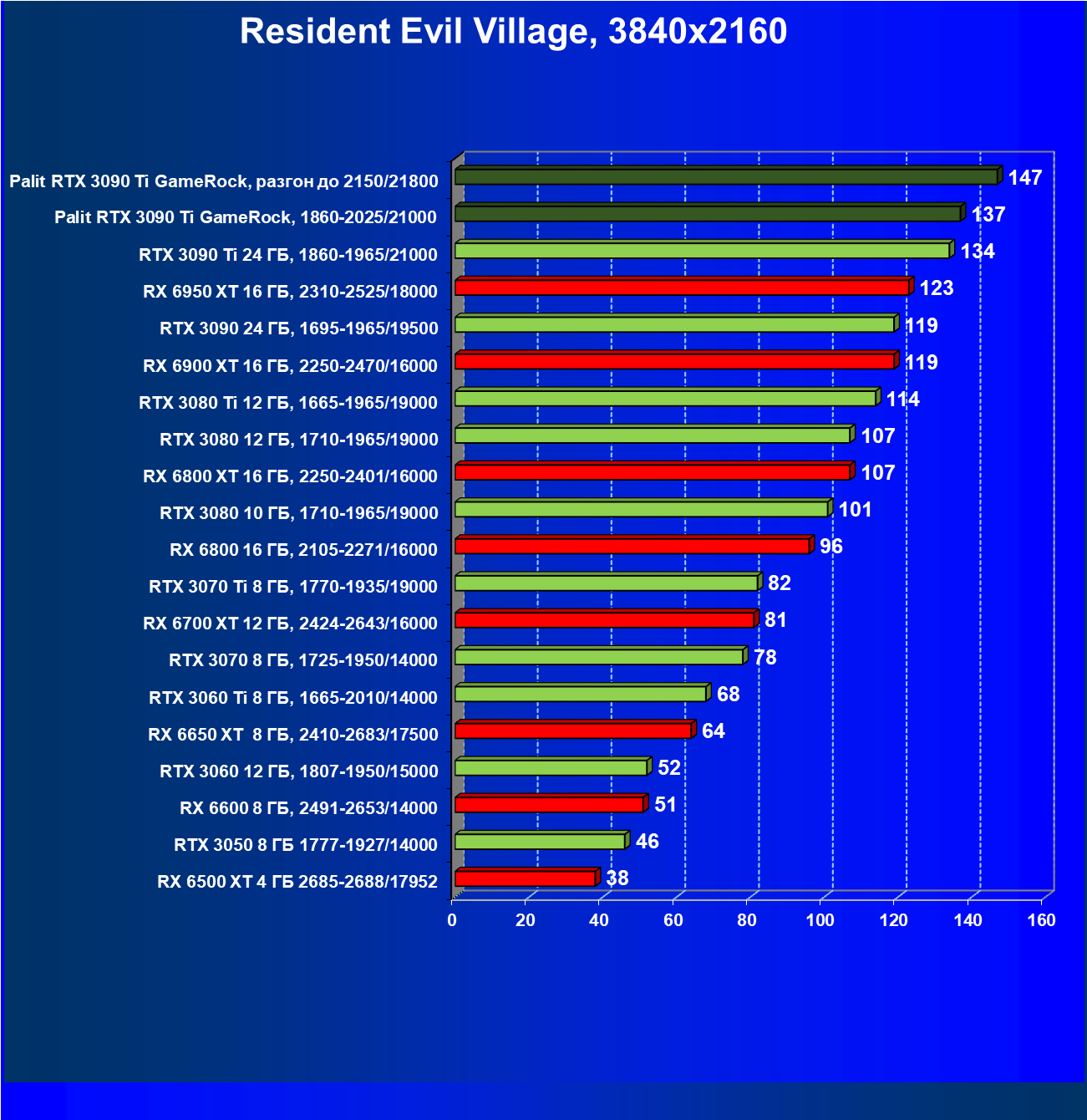 Как ранее мы уже отмечали: лидер есть лидер во всех отношениях, причем повышенные частоты работы карты позволили ей обойти флагмана AMD — Radeon RX 6950 XT.