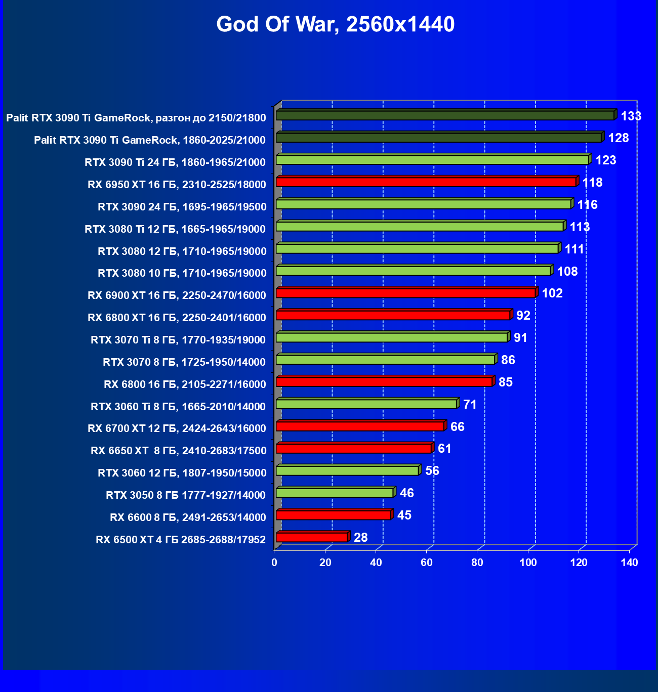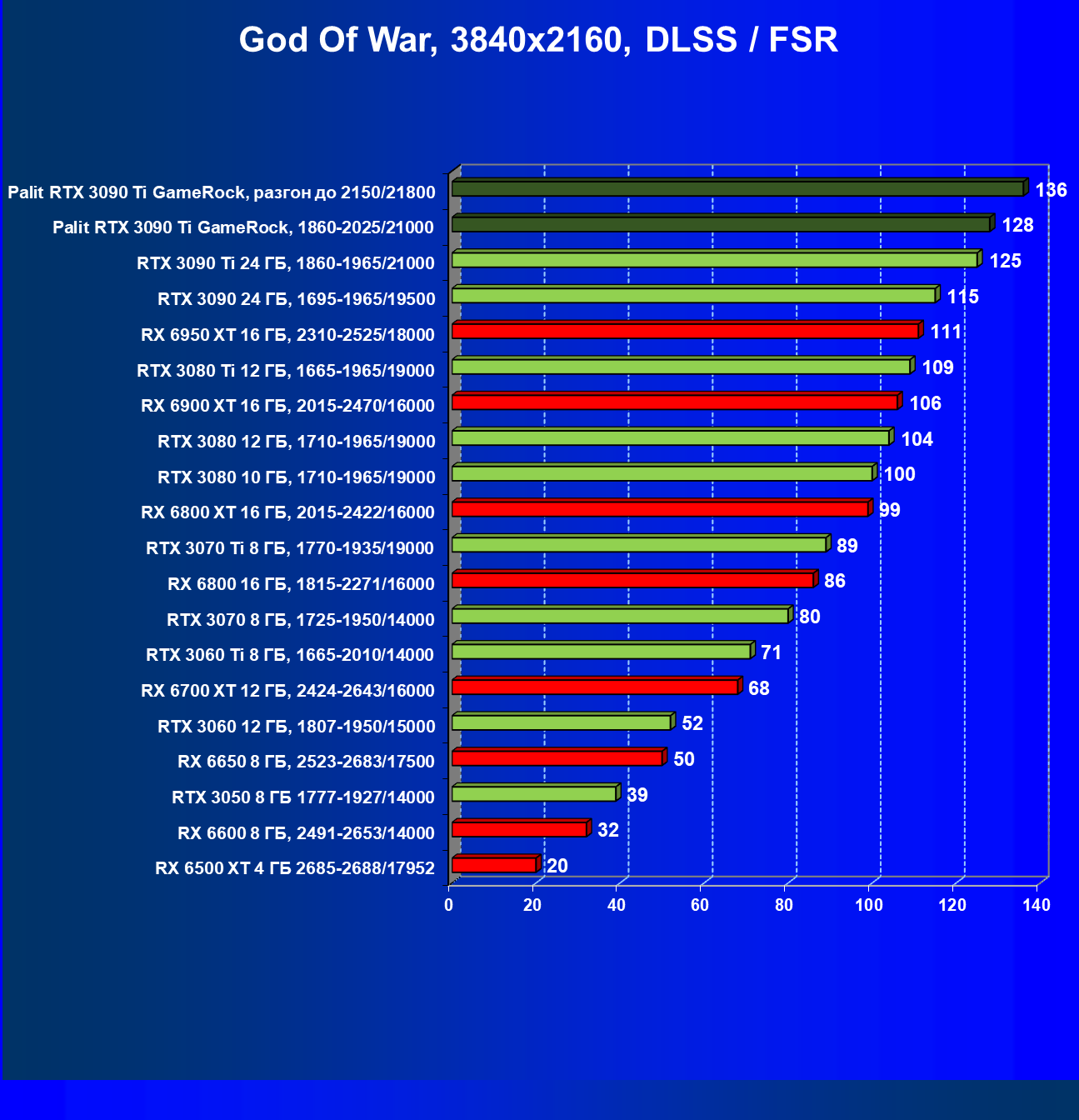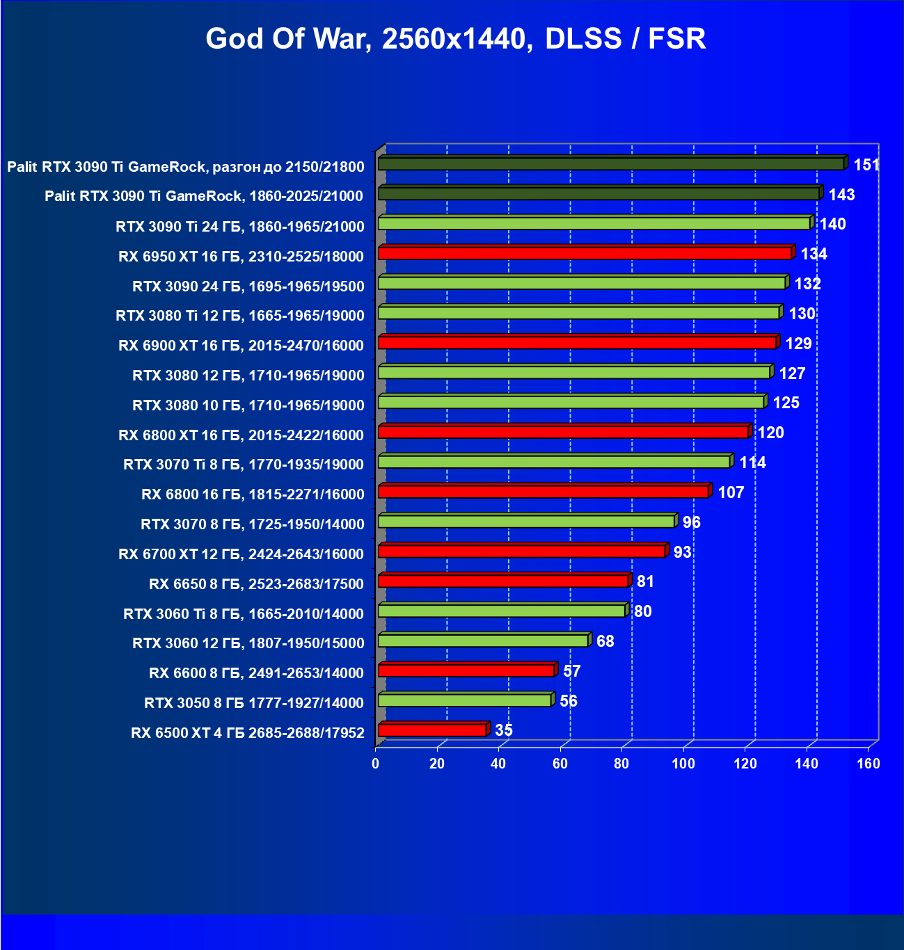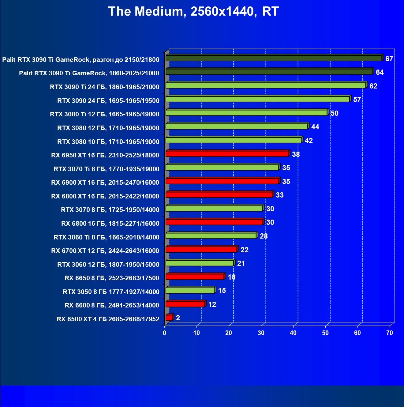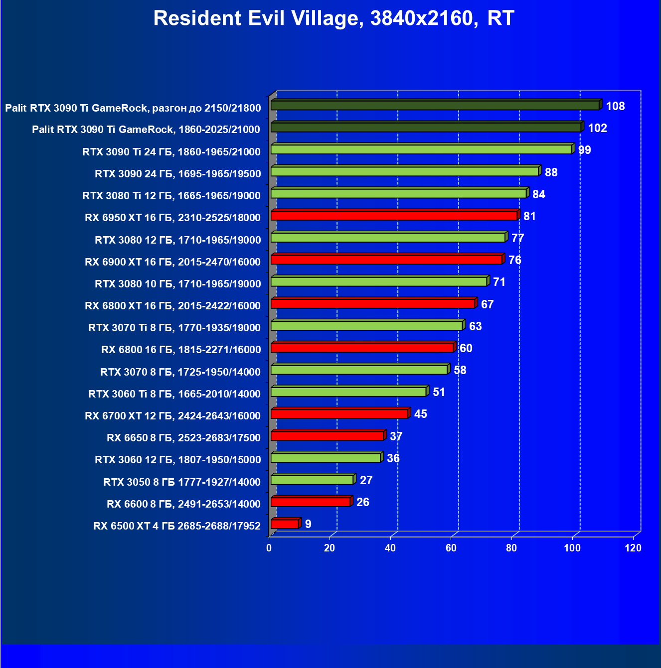 Как ранее мы уже отмечали: лидер есть лидер во всех отношениях, причем повышенные частоты работы карты позволили ей обойти флагмана AMD — Radeon RX 6950 XT.