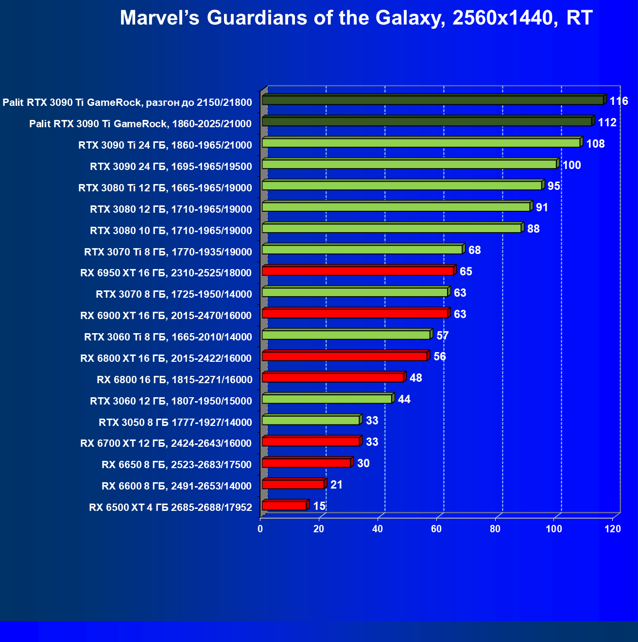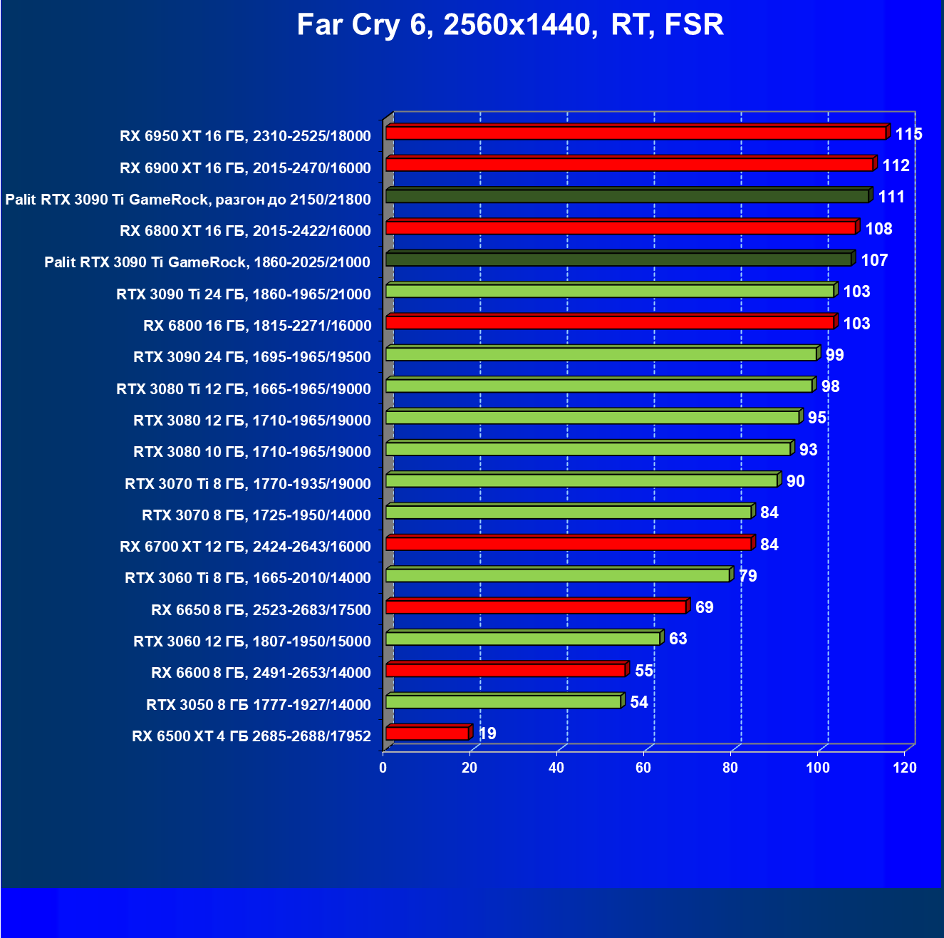 | 14 | RX 6950 XT 16 ГБ, 2310—2525/18000 | 63 | 678 | 108 000 |