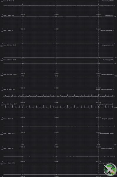 В этом случае температура чуть повысилась до 75 °C по ядру и 76 °C по памяти, а обороты вентиляторов немного упали. Энергопотребление карты также чуть упало до 462 Вт (в пике).