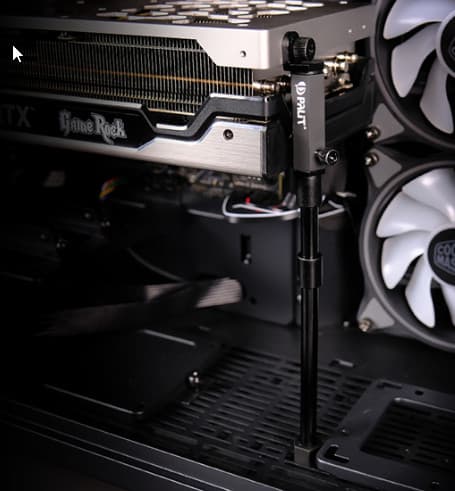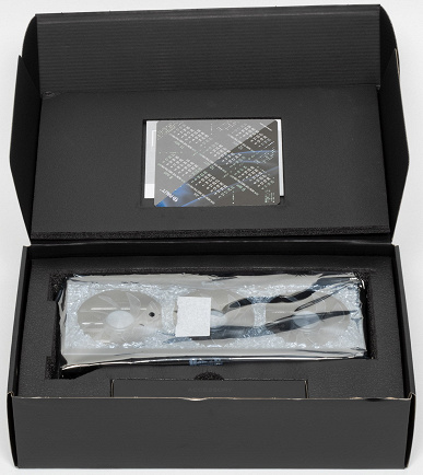 Такая подставка способна также поддерживать две карты, если они установлены в системном блоке. Для этого имеется особый кронштейн, надеваемый на опору. В целом идея отличная, ибо ранее просто бездумно комплектовали карты серии GameRock тем же акриловым кронштейном-подставкой, что и серию GamingPro. А тот кронштейн крепится под видеокартой, занимая два слота под ней. И если в случае GamingPro карты упираются в подставку просто кожухом, то карты GameRock должны были упираться той самой «хрустальной» отделкой с подсветкой, что как бы не способствовало целостности оной.