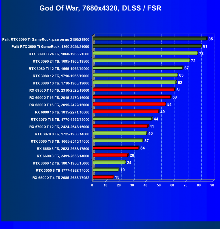 Сегодня нормально поиграть в таком разрешении можно только на самых флагманских и дорогих видеокартах уровня RTX 3090 Ti/3090/3080 Ti/3080, а также RX 6950/6900 XT, да и то список не столь велик: для приемлемого комфорта в таких играх требуется обязательная поддержка DLSS (или FSR), разумеется, желательно использование трассировки лучей.