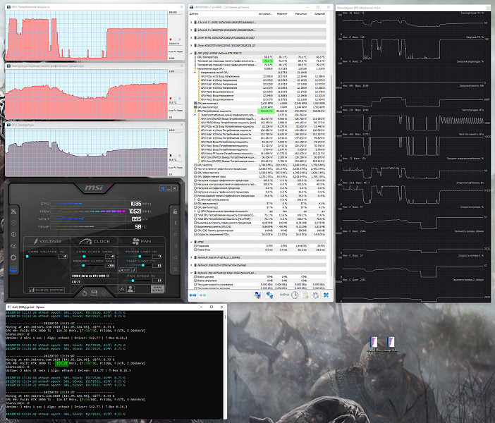 Оптимизация настроек работы видеокарт под майнинг в нашем случае не предусматривает сильного разгона видеопамяти, также обязательным является внешний обдув видеокарт. Особо тщательно надо следить за нагревом GDDR6X, ибо максимум для этой памяти — 110 градусов, и она долго не проживет, постоянно работая в условиях нагрева выше 100 °C.