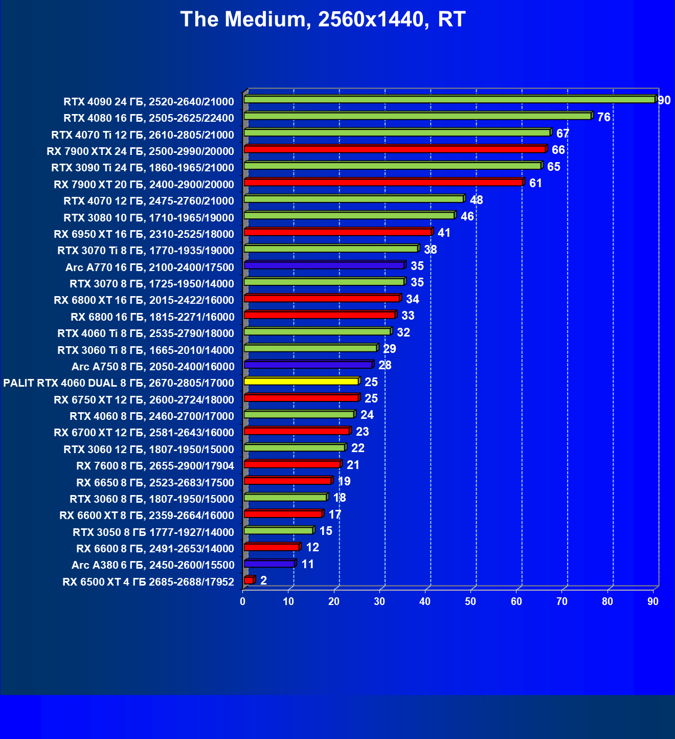 | 20 | Palit RTX 4060 Dual 8 ГБ, 2670—2805/17000 | 288 | 90 | 32 000 |