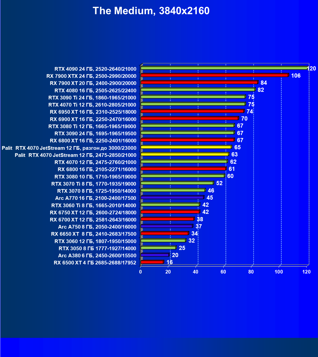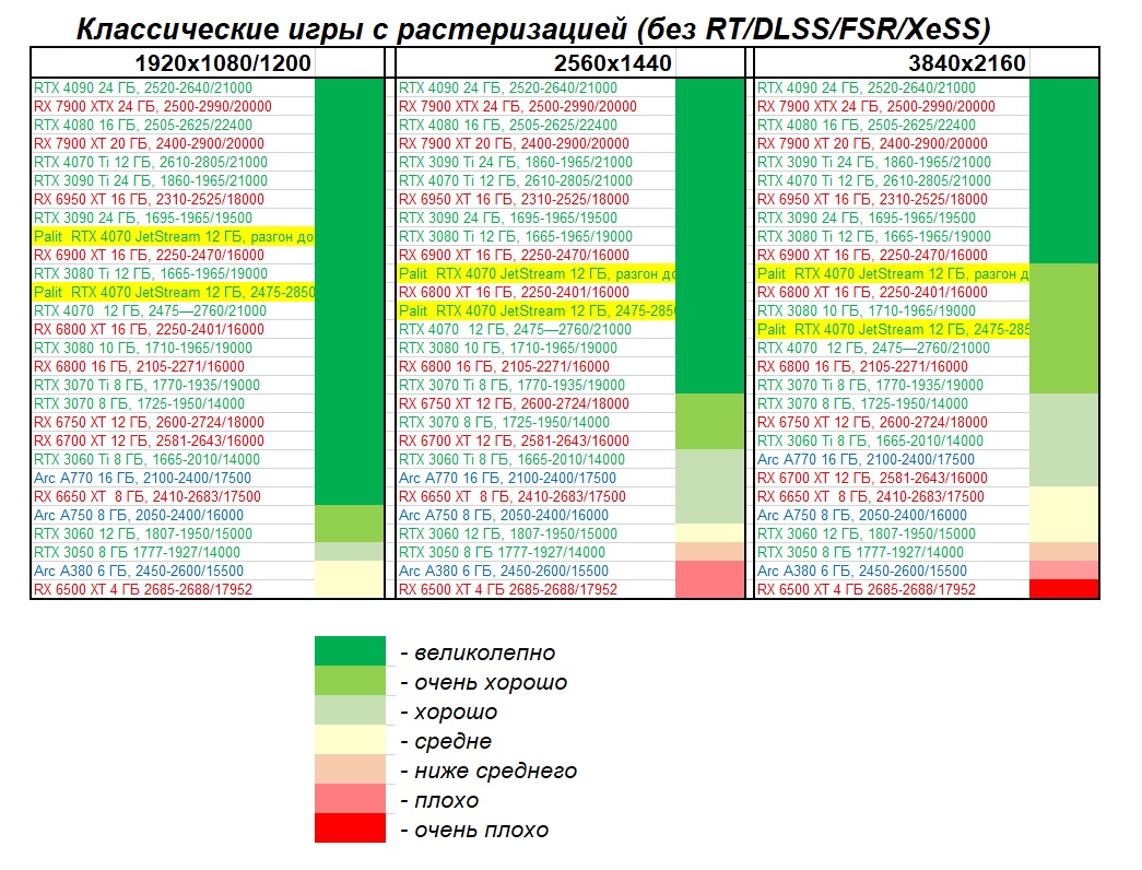 | 13 | Palit RTX 4070 JetStream 12 ГБ, 2475—2850/21000 | 458 | 73 | 62 500 |