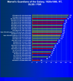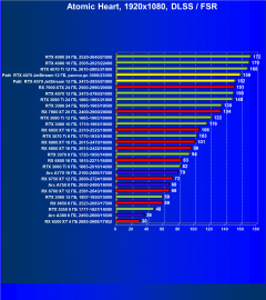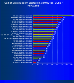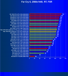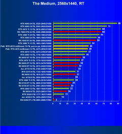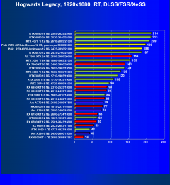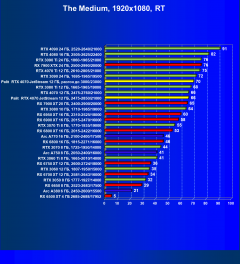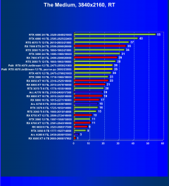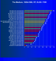 Рейтинг составлен по 9 тестам, в которых используется технология трассировки лучей и одновременно технологии Nvidia DLSS, AMD FSR или Intel XeSS. Этот рейтинг нормирован по самому слабому ускорителю в данной группе — Radeon RX 6500 XT (то есть сочетание скорости и функций Radeon RX 6500 XT приняты за 100%).