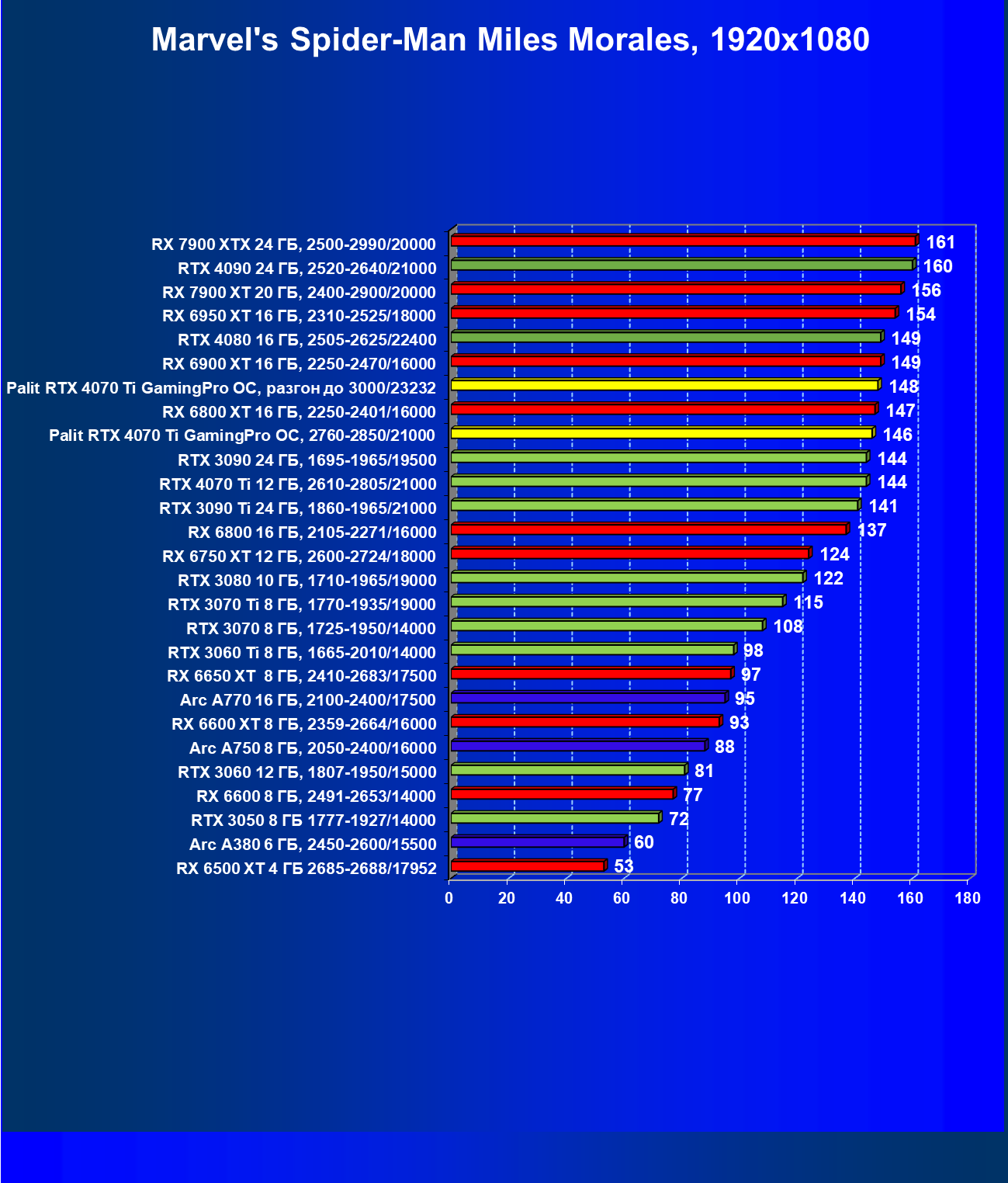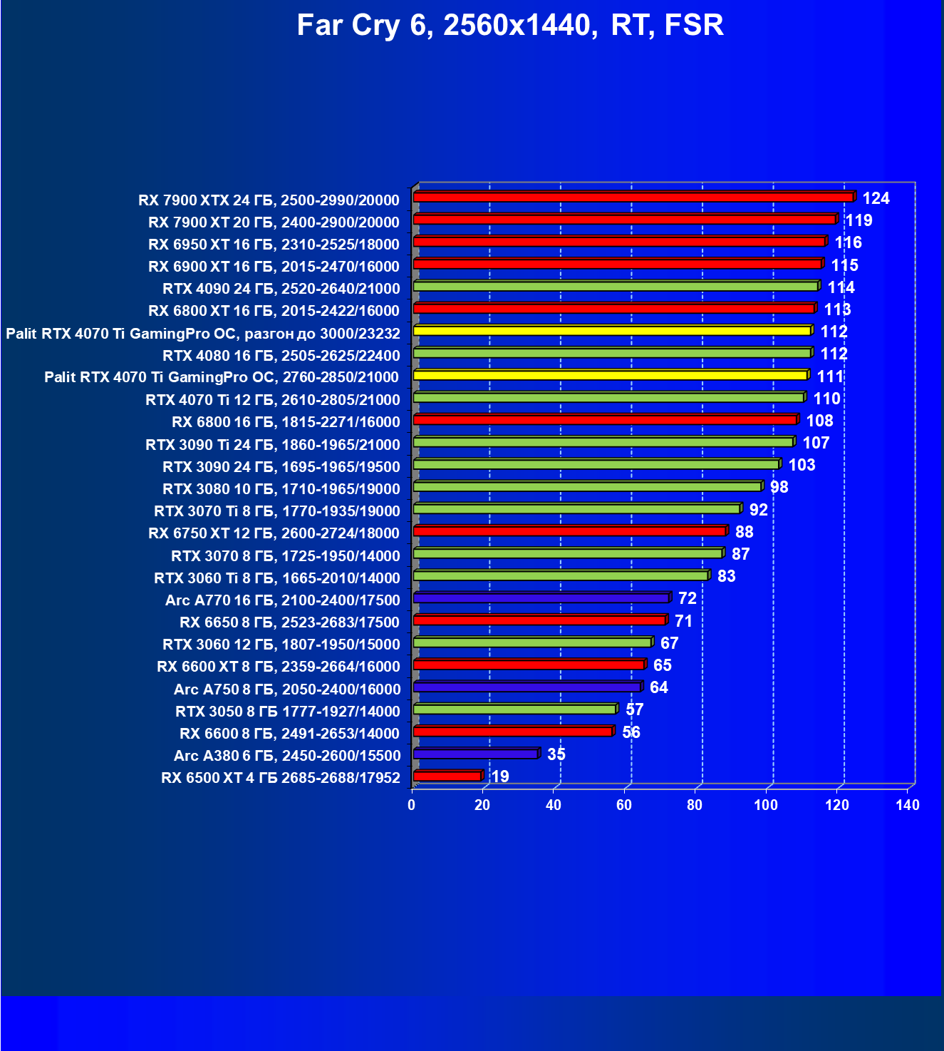 Вот здесь (из-за большей уязвимости производительности карт клана Radeon при использовании RT) уже совсем иная картина: и RTX 4070 Ti одержал верх даже над RX 7900 XTX (чуть-чуть, но быстрее, а карта Palit засчет фабричного разгона этот разрыв чуть увеличила). При этом RTX 4070 Ti оказался быстрее, чем RX 7900 XT на 14%, что полностью затмевает предыдущее поражении в сражении в классических играх.