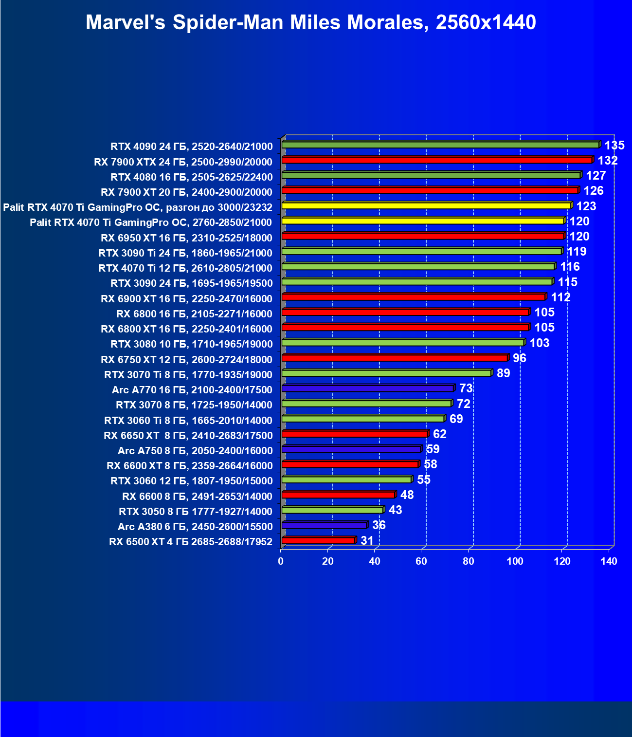 | 05 | Palit RTX 4070 Ti GamingPro OC, 2760—2850/21000 | 127 | 981 | 77 000 |