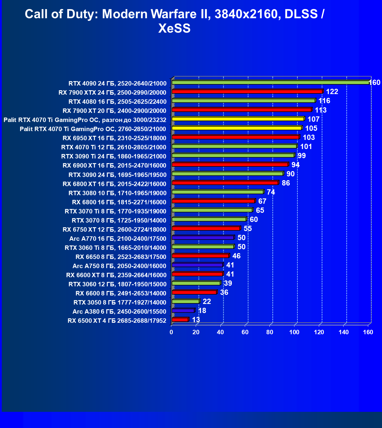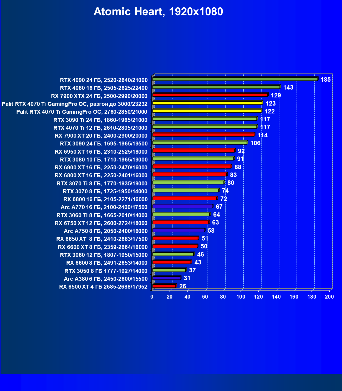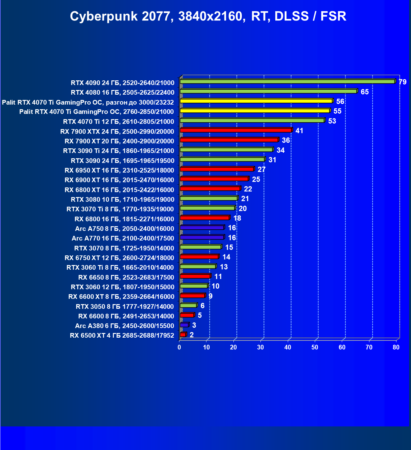 | 02 | Palit RTX 4070 Ti GamingPro OC, разгон до 3000/23232 | 130 | 999 | 77 000 |