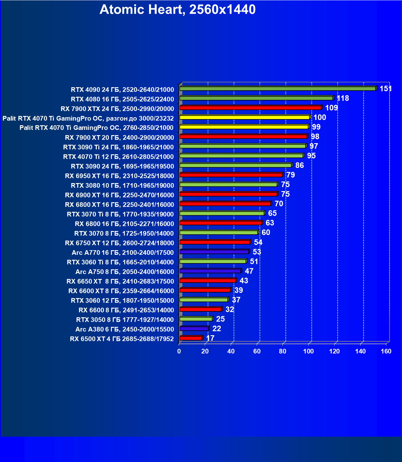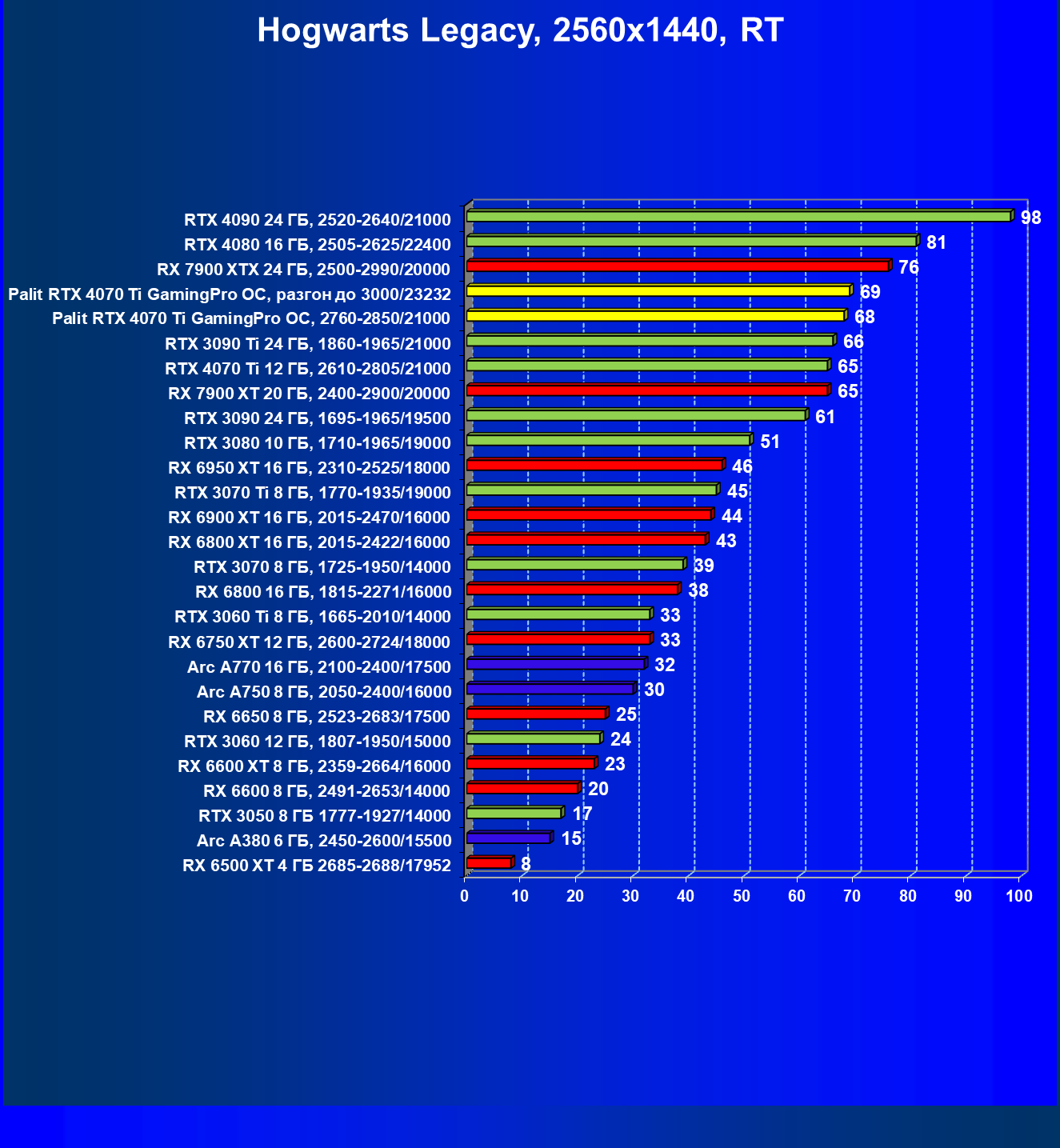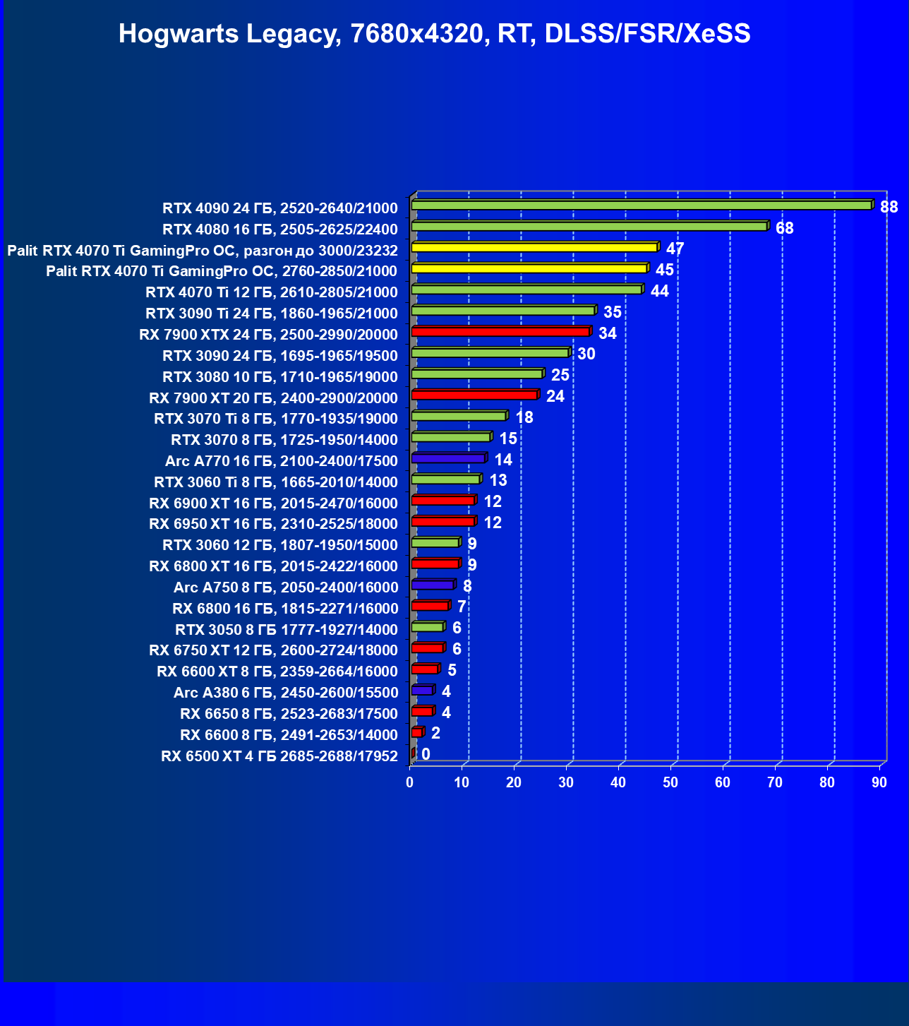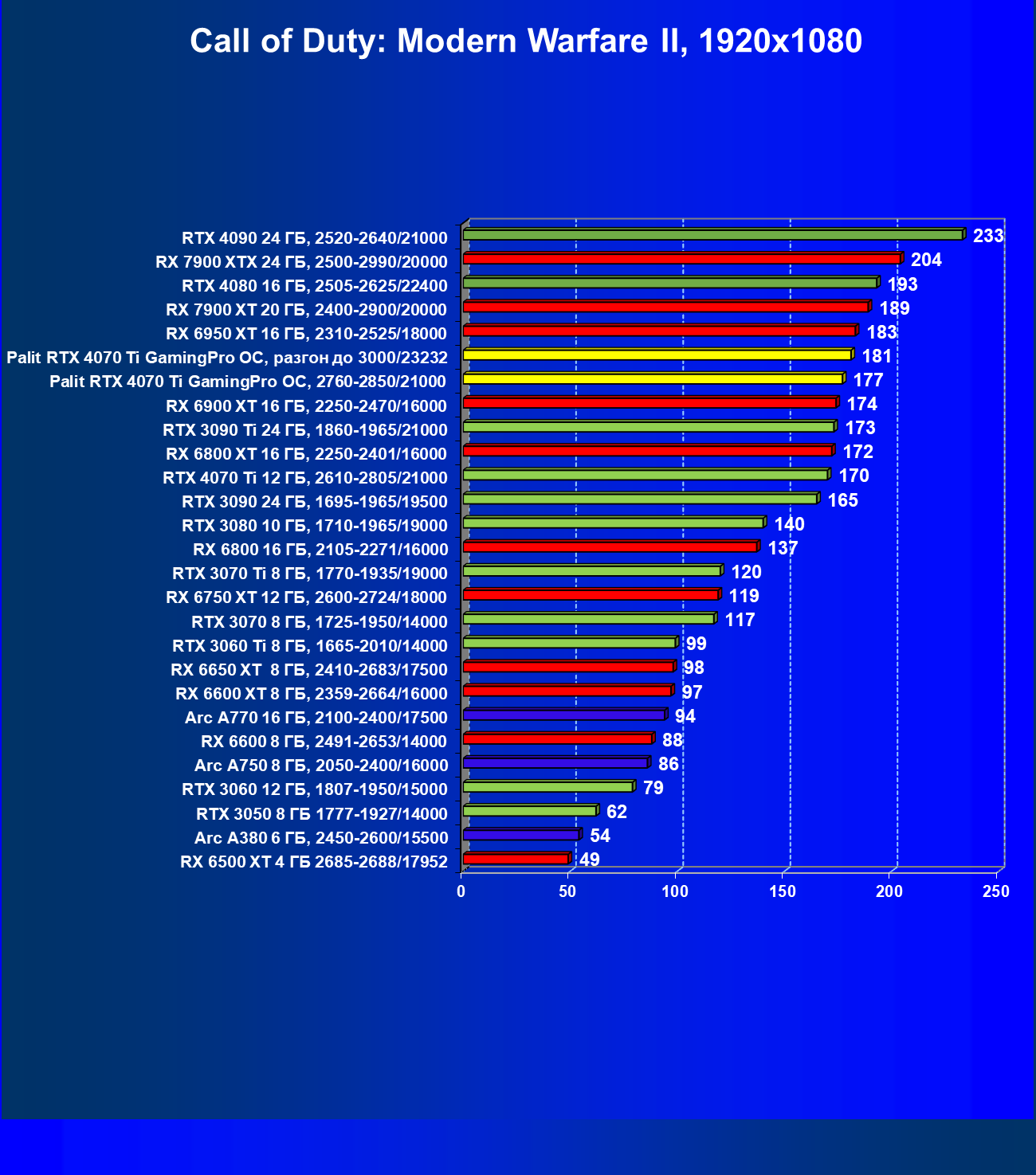 | 03 | Palit RTX 4070 Ti GamingPro OC, разгон до 3000/23232 | 1686 | 219 | 77 000 |