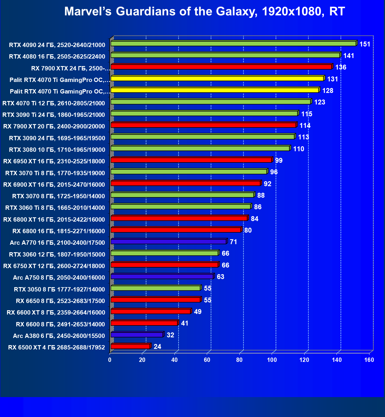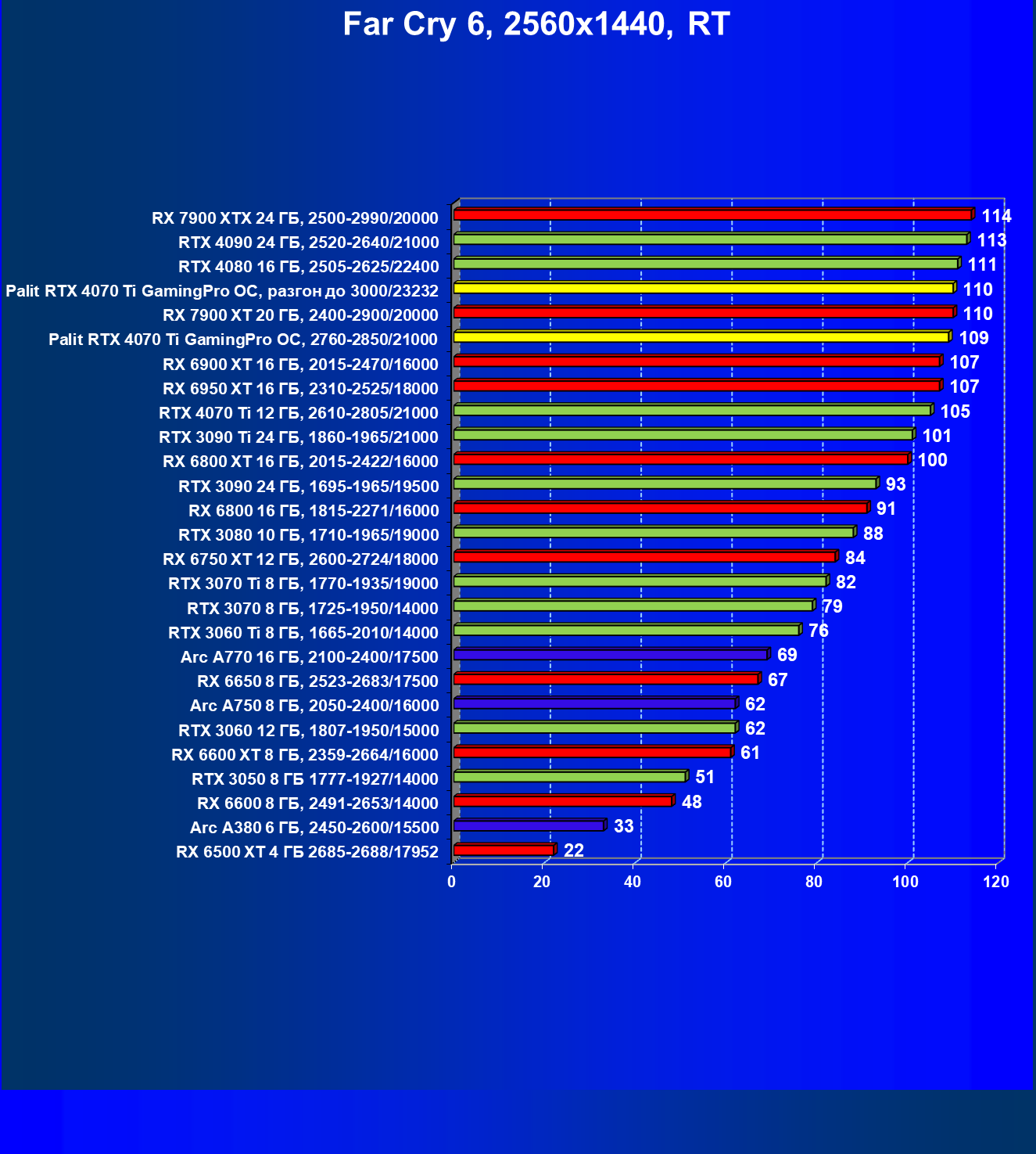| 21 | RX 6950 XT 16 ГБ, 2310—2525/18000 | 109 | 874 | 80 000 |