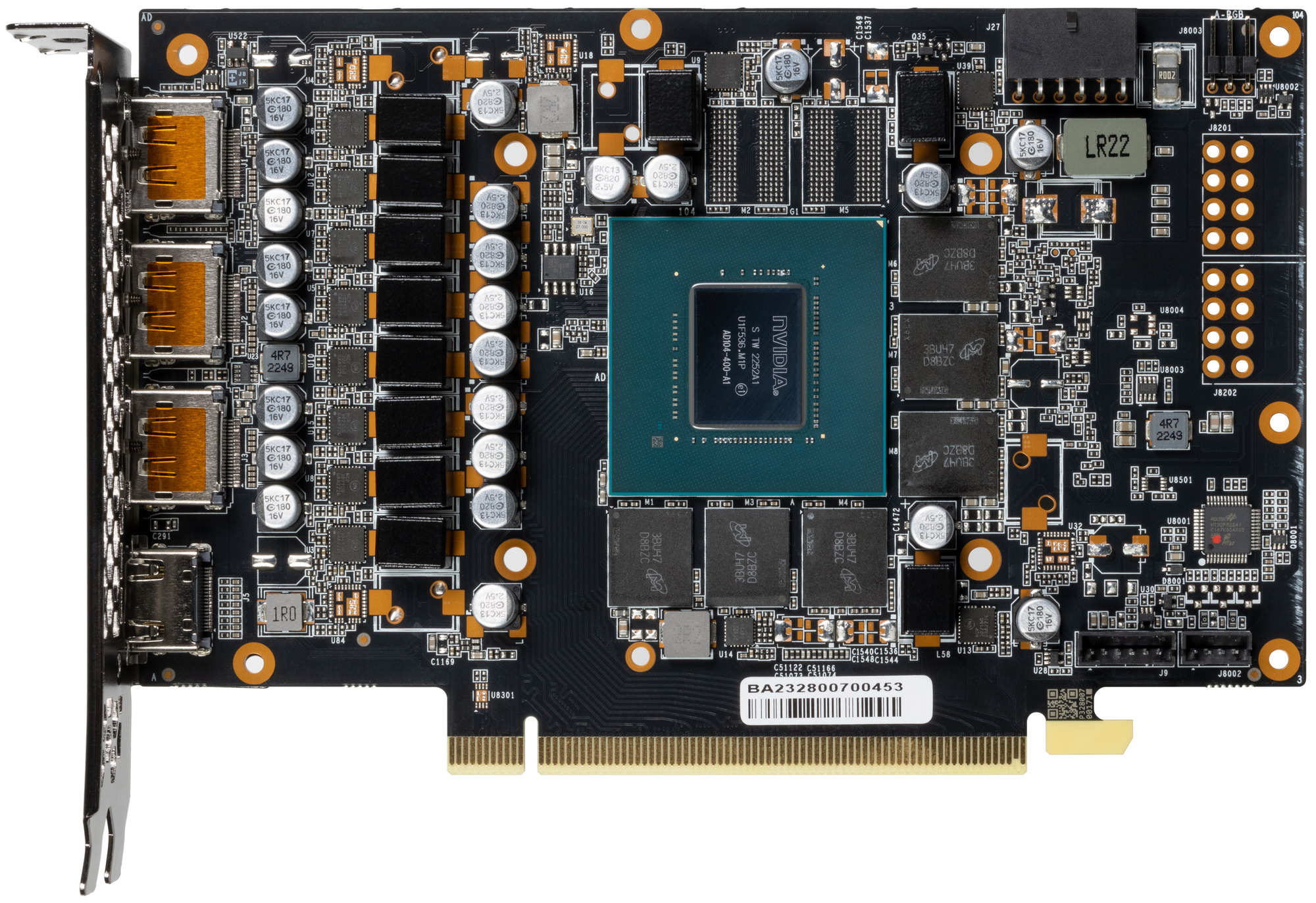 Отлично видна большая разница в разводке печатных плат обоих моделей. Palit GeForce RTX 4070 Ti GameRock имеет больше фаз питания GPU, это потребовало более высокую PCB, поэтому засчет выноса стабилизатора питания с правой стороны — на верх, длина печатной платы сильно сократилась. Сбоку справа на карте мы видим посадочные места, похожие на те, куда устанавливаются 8-контактные разъемы питания. На самом деле они предназначены для подключения мощных внешних вентиляторов в системах, использующих профессиональные версии подобных видеокарт (для игровых и профессиональных видеокарт используются одни и те же GPU, разница может быть лишь в объеме памяти, конфигурации рабочих блоков и, конечно же, в программном обеспечении).