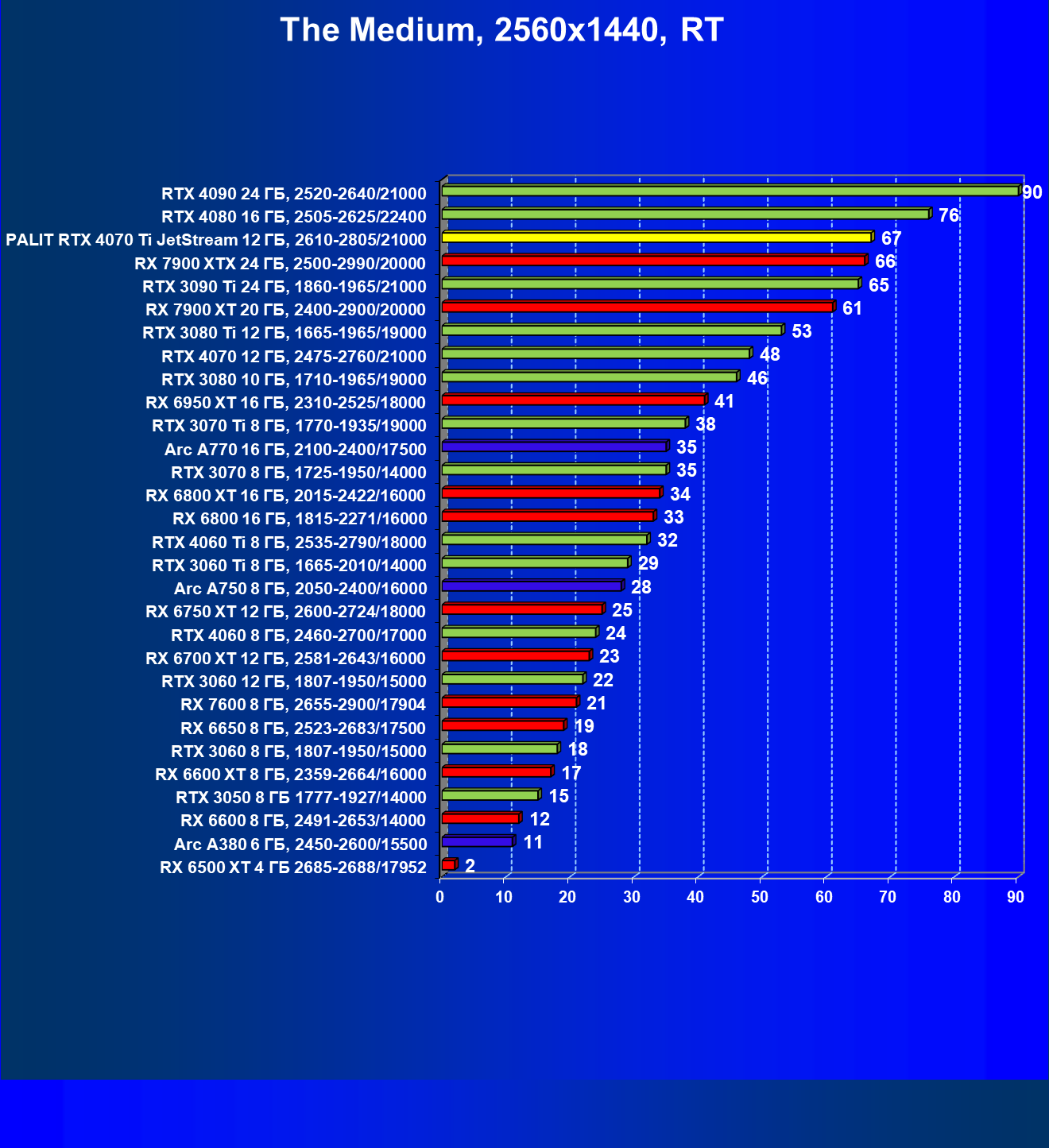 | 08 | Palit RTX 4070 Ti JetStream 12 ГБ, 2610—2805/21000 | 193 | 1619 | 84 000 |