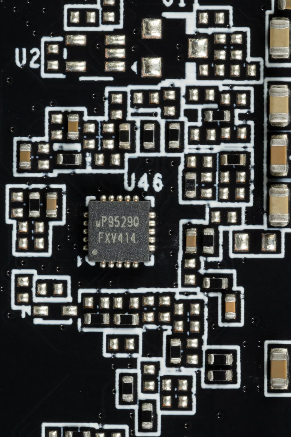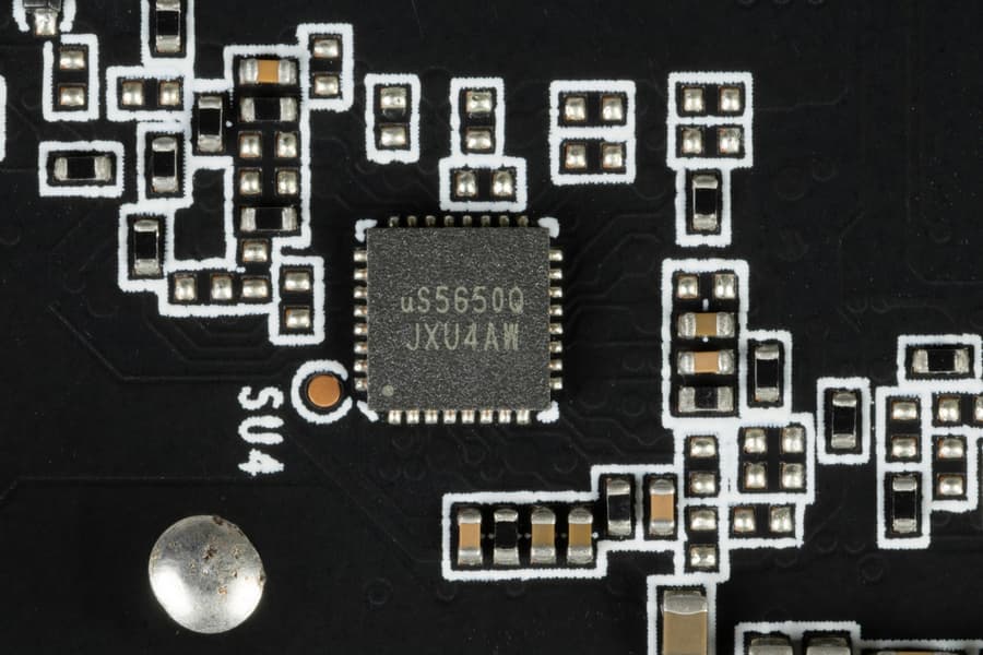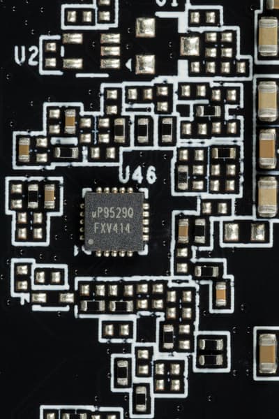 Также на тыльной стороне платы имеется контроллер uP5650Q (uPI Semi), который отвечает за мониторинг карты (отслеживание напряжений и температуры).