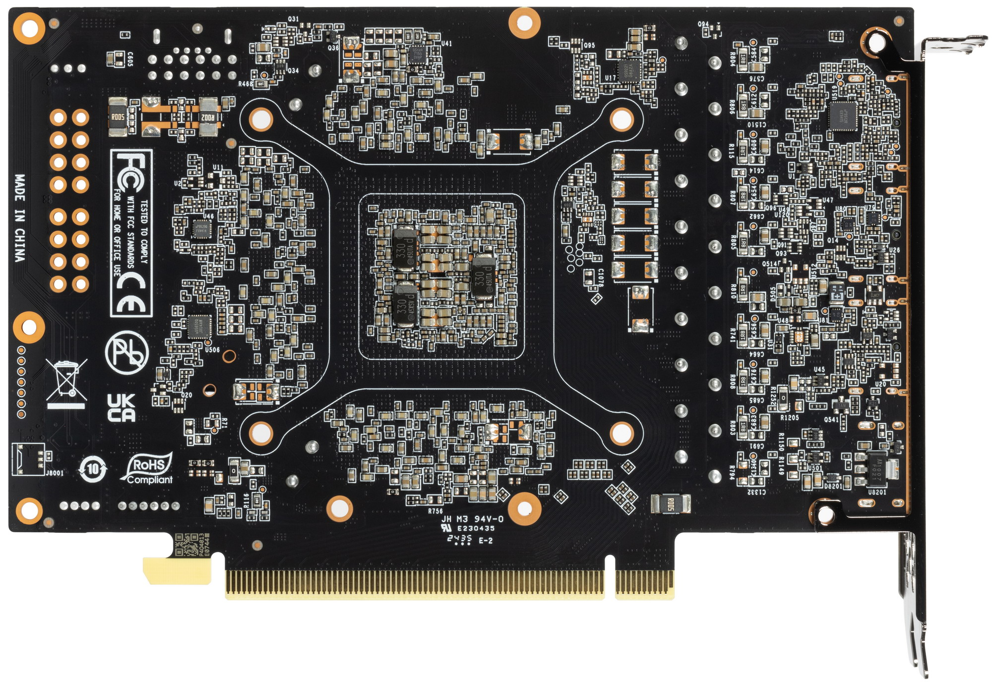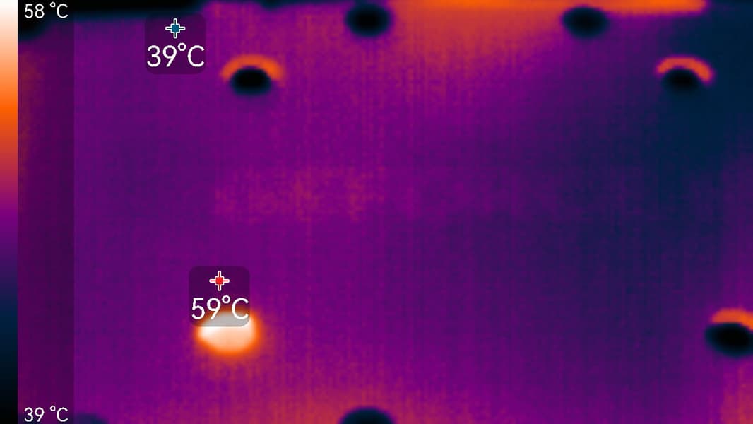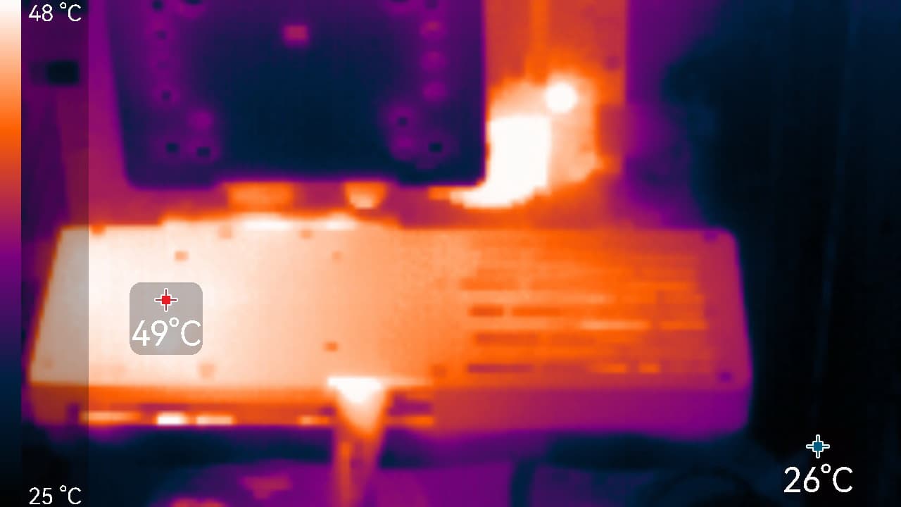 Максимальный нагрев наблюдался в центральной части PCB и у разъемов PCIe и питания.