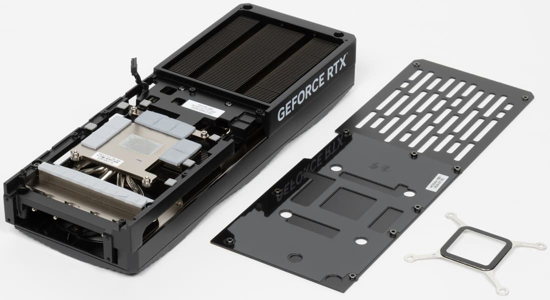 Трубки припаяны к большой медной никелированной пластине, которая охлаждает как ядро, так и микросхемы памяти (через термопрокладки). А для охлаждения преобразователей питания VRM имеется свой теплосъемник на массивной раме, прикрученной к радиатору (рама служит также элементом жесткости всей конструкции).
