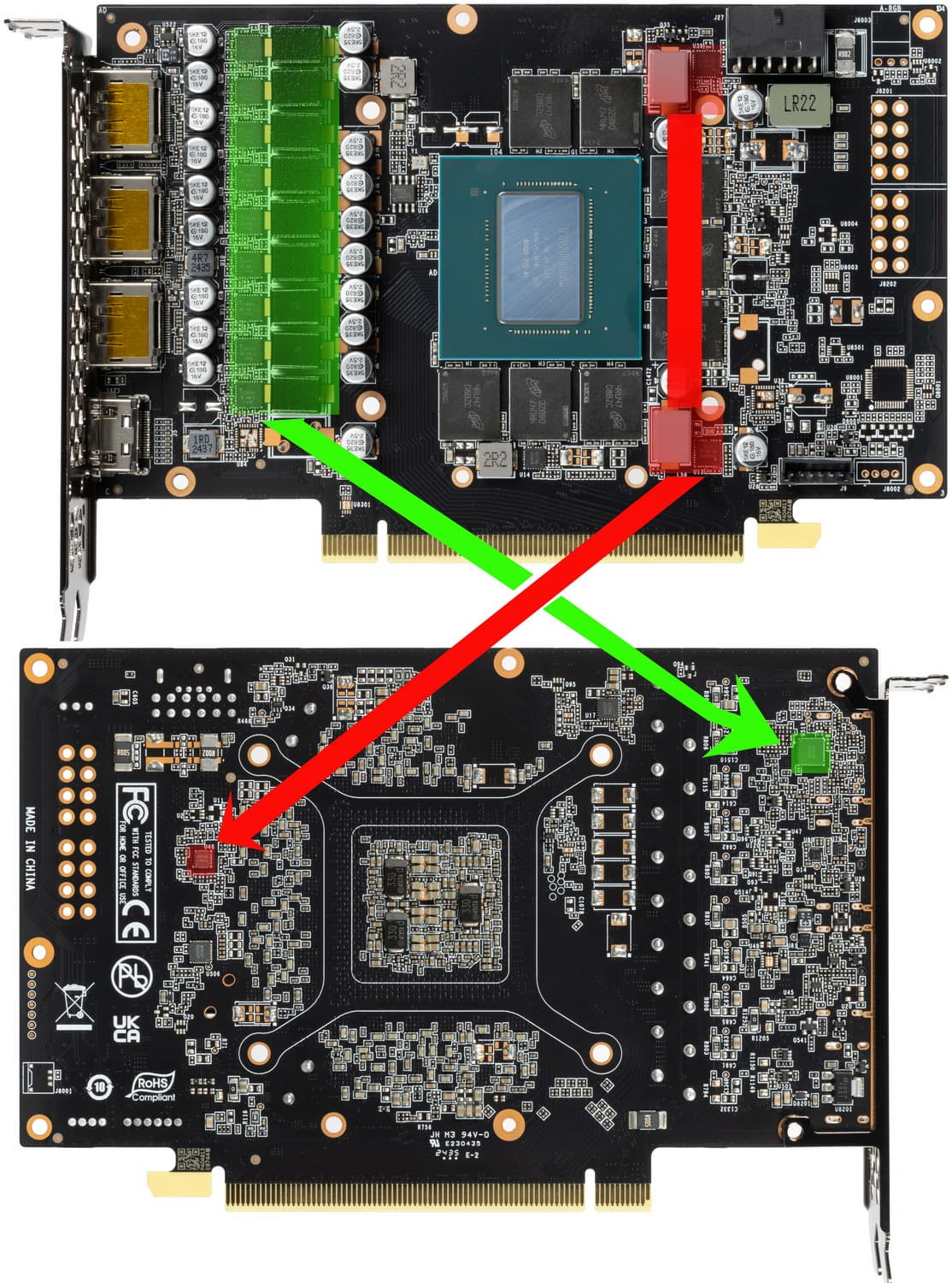 Зеленым цветом отмечена схема питания ядра, красным — памяти. Все ШИМ-контроллеры расположены на оборотной стороне PCB.
