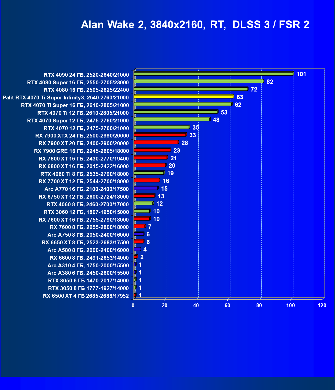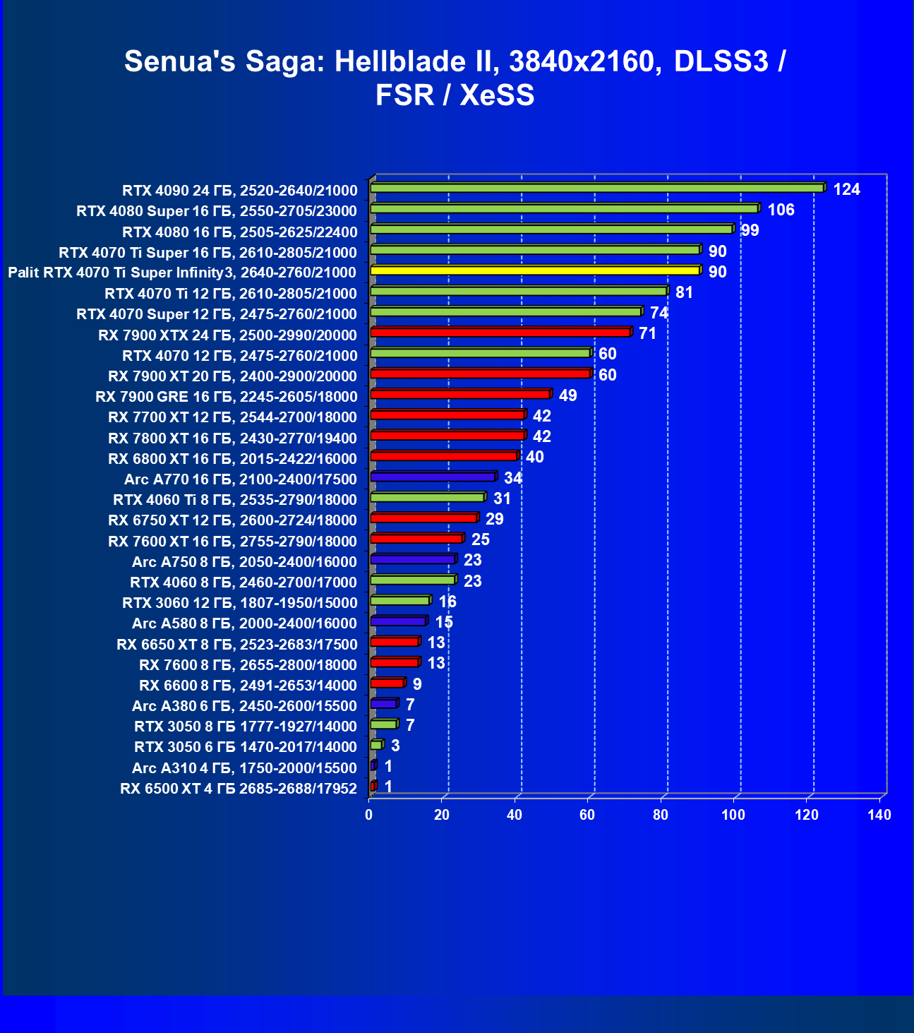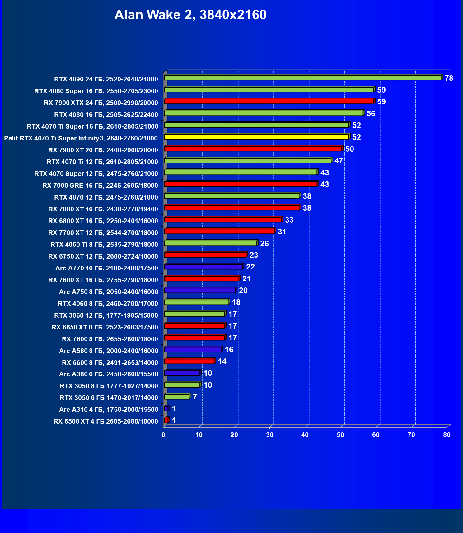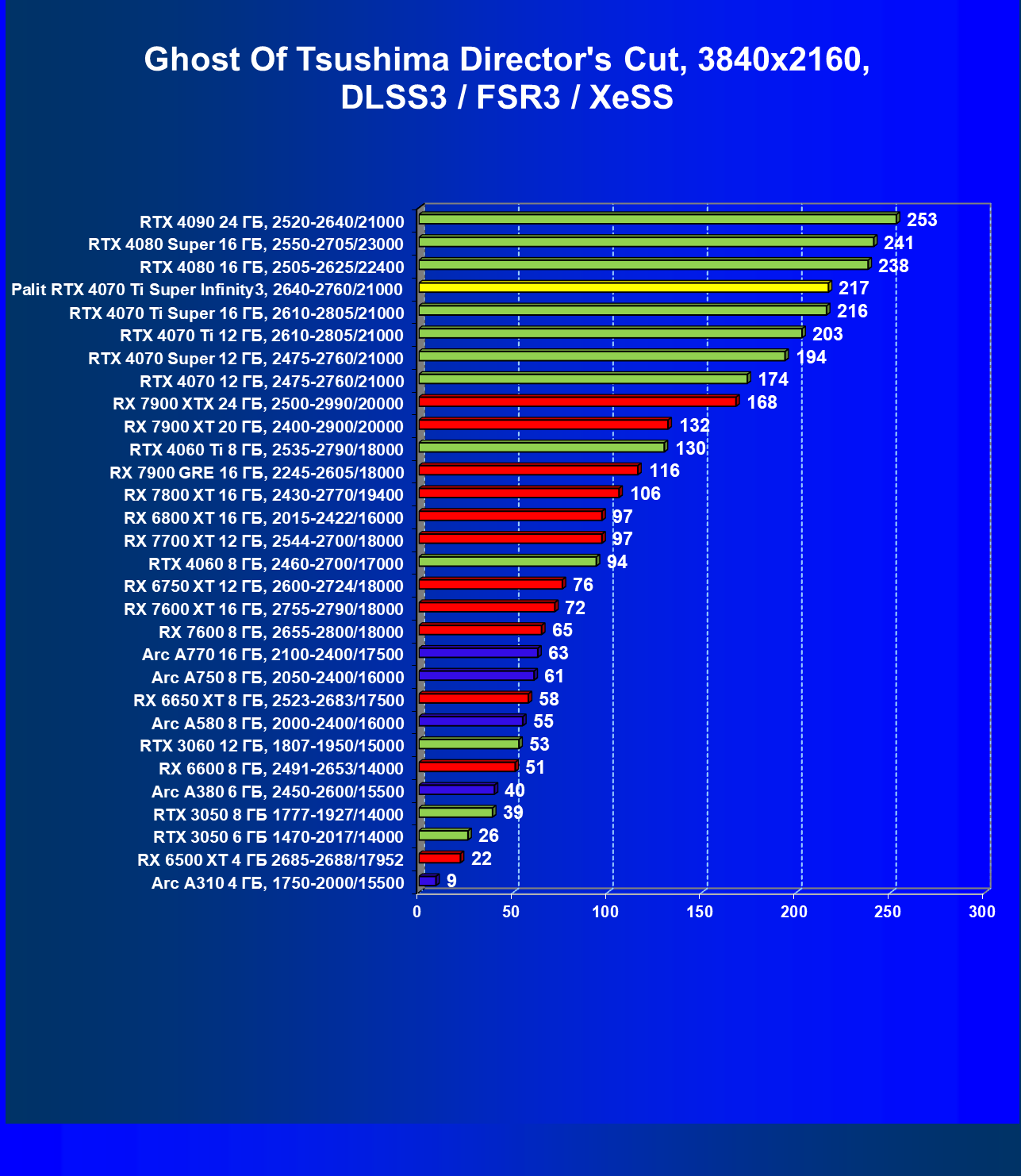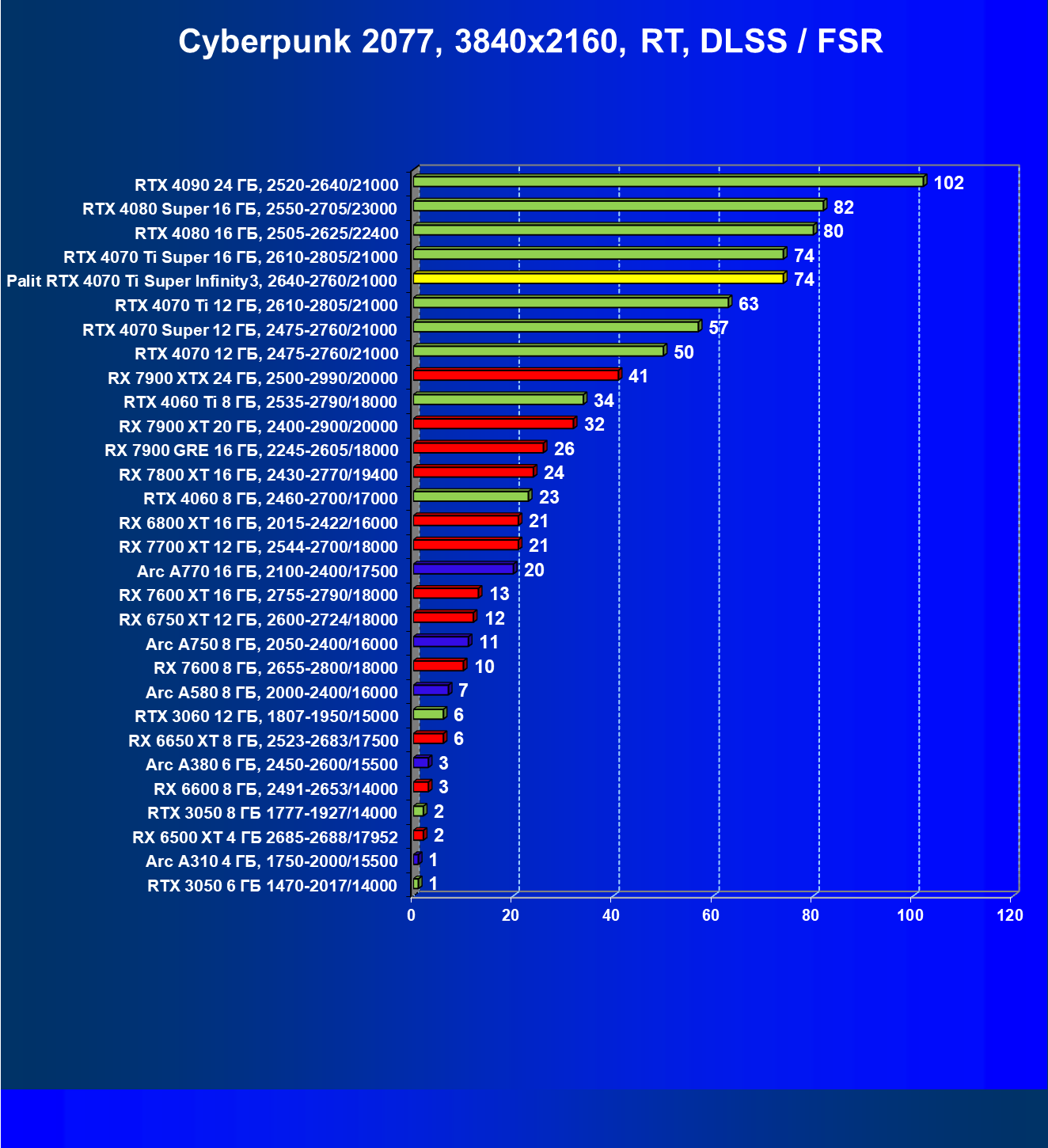 | 03 | Palit RTX 4070 Ti Super Infinity3, 2640—2760/21000 | 640 | 6011 | 94 000 |
