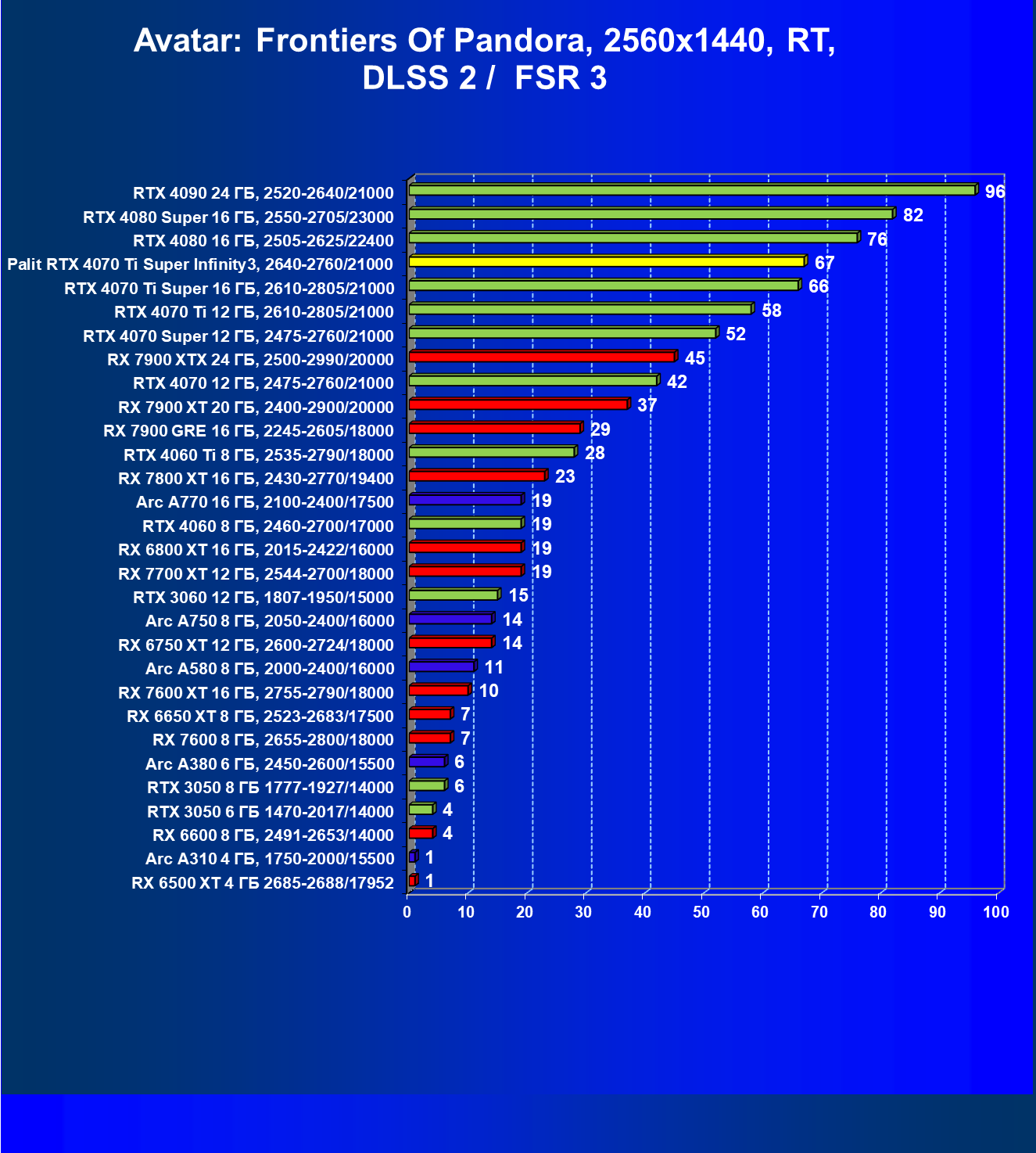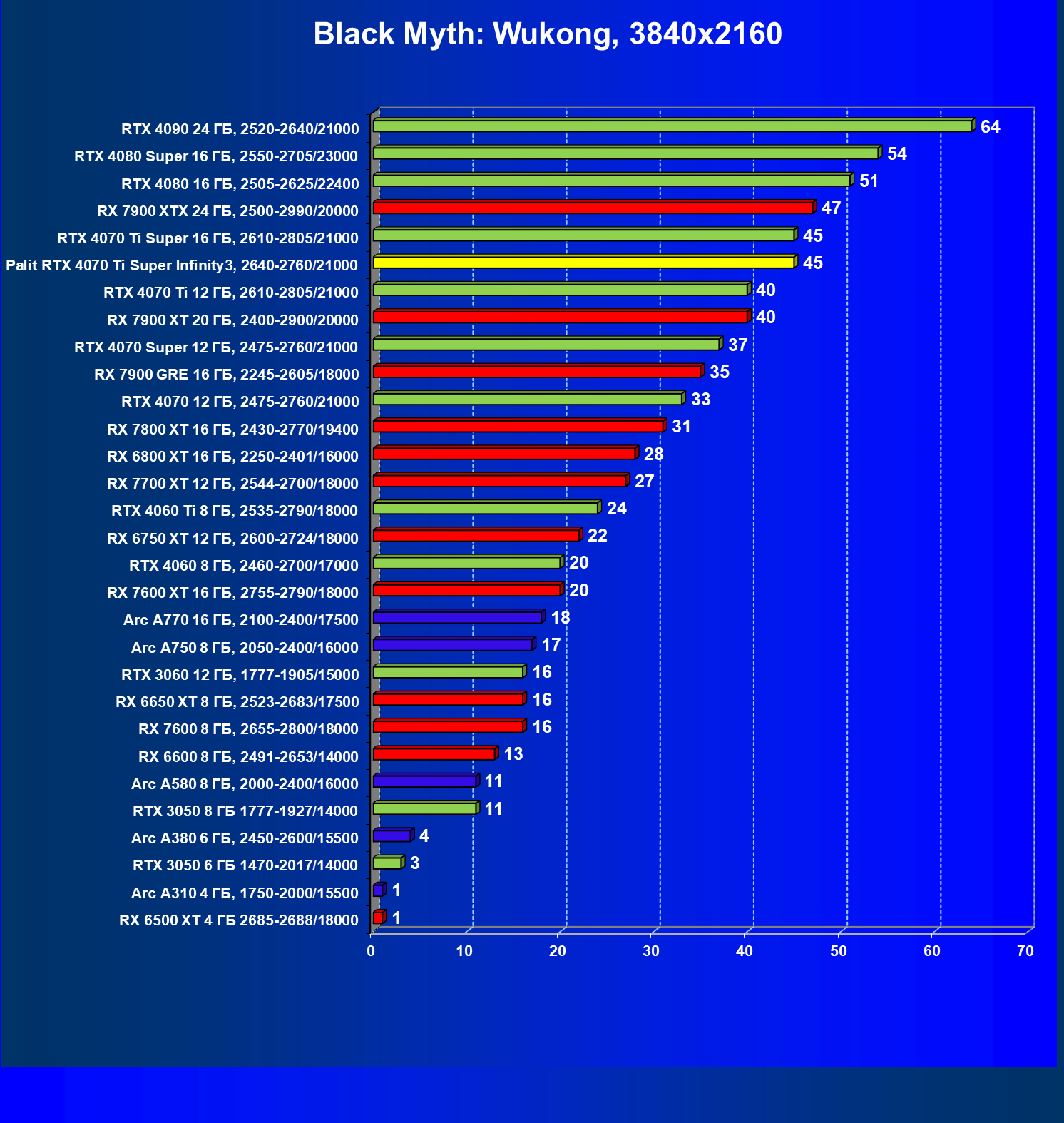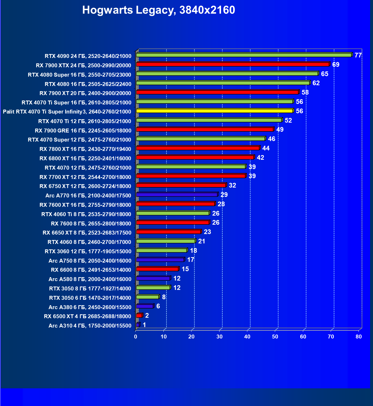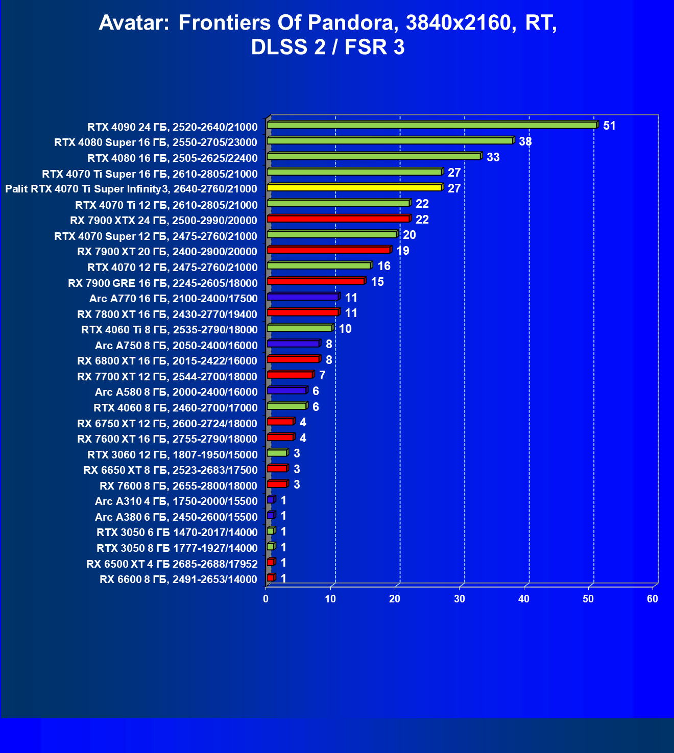 | 03 | Palit RTX 4070 Ti Super Infinity3, 2640—2760/21000 | 640 | 6011 | 94 000 |
