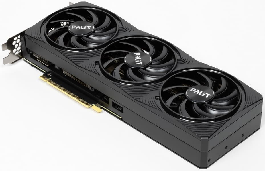 Palit GeForce RTX 4070 Ti Super Infinity3 OC (16 ГБ) — еще один вариант ускорителя высокого уровня, созданный специально для компактных ПК. Точнее, так это заявляется, однако на практике карта всё равно крупная и толстая (29 см в длину, 12 см в высоту, 5 см в толщину) и в типовые корпуса под платы формата Mini-ITX не влезет как минимум по толщине (более двух слотов). Никаких других признаков ориентации на компактные системы мы не обнаружили, печатная плата не переделана относительно «массовой» версии JetStream, просто уменьшен по толщине кулер. И поскольку никакого даунвольтинга, например, не проведено, то потребление карты вполне типичное (до 284 Вт), а нагрев и шум выше, чем у типичных решений на GeForce RTX 4070 Ti Super. Набор видеовыходов стандартный: 3 DP и 1 HDMI.