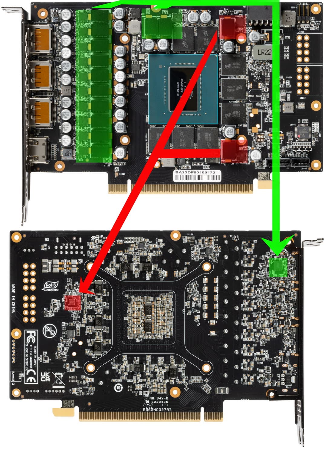 Зеленым цветом отмечена схема питания ядра, красным — памяти. Все ШИМ-контроллеры расположены на оборотной стороне PCB.