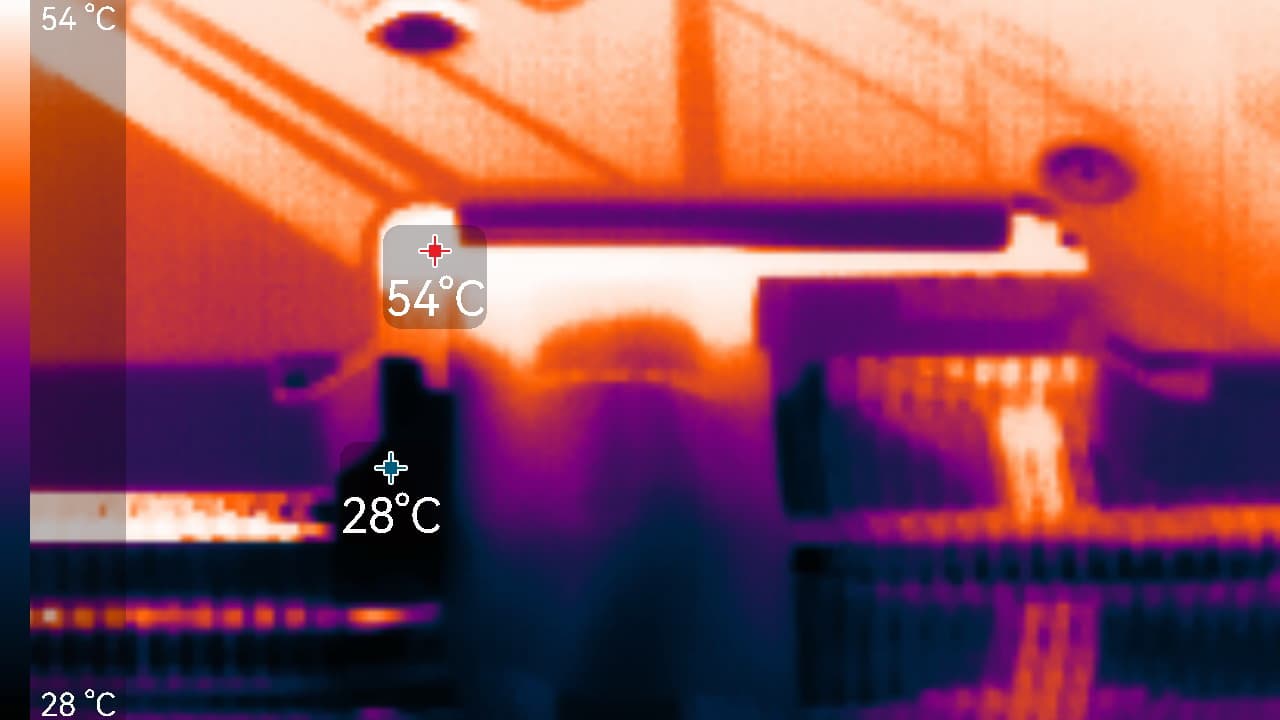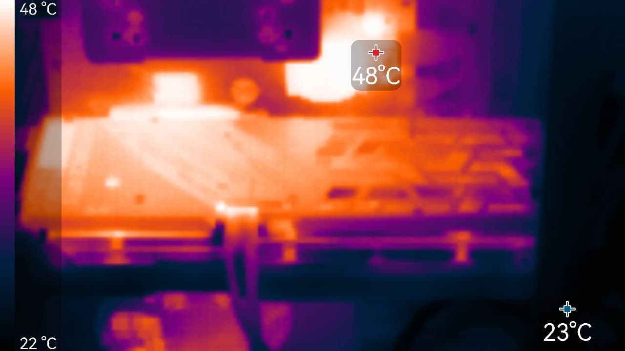 Максимальный нагрев наблюдался в центральной части PCB и у разъемов PCIe и питания.