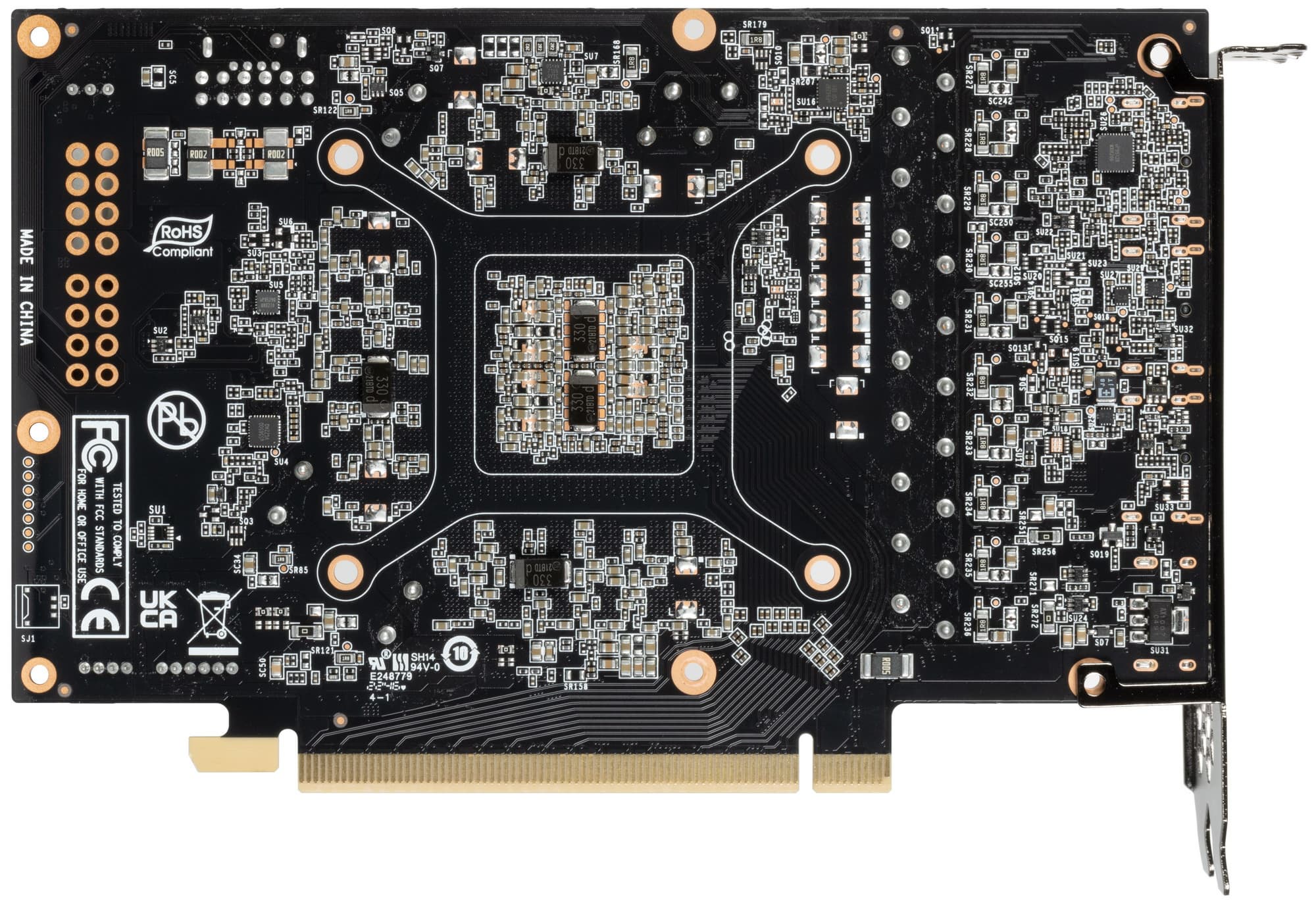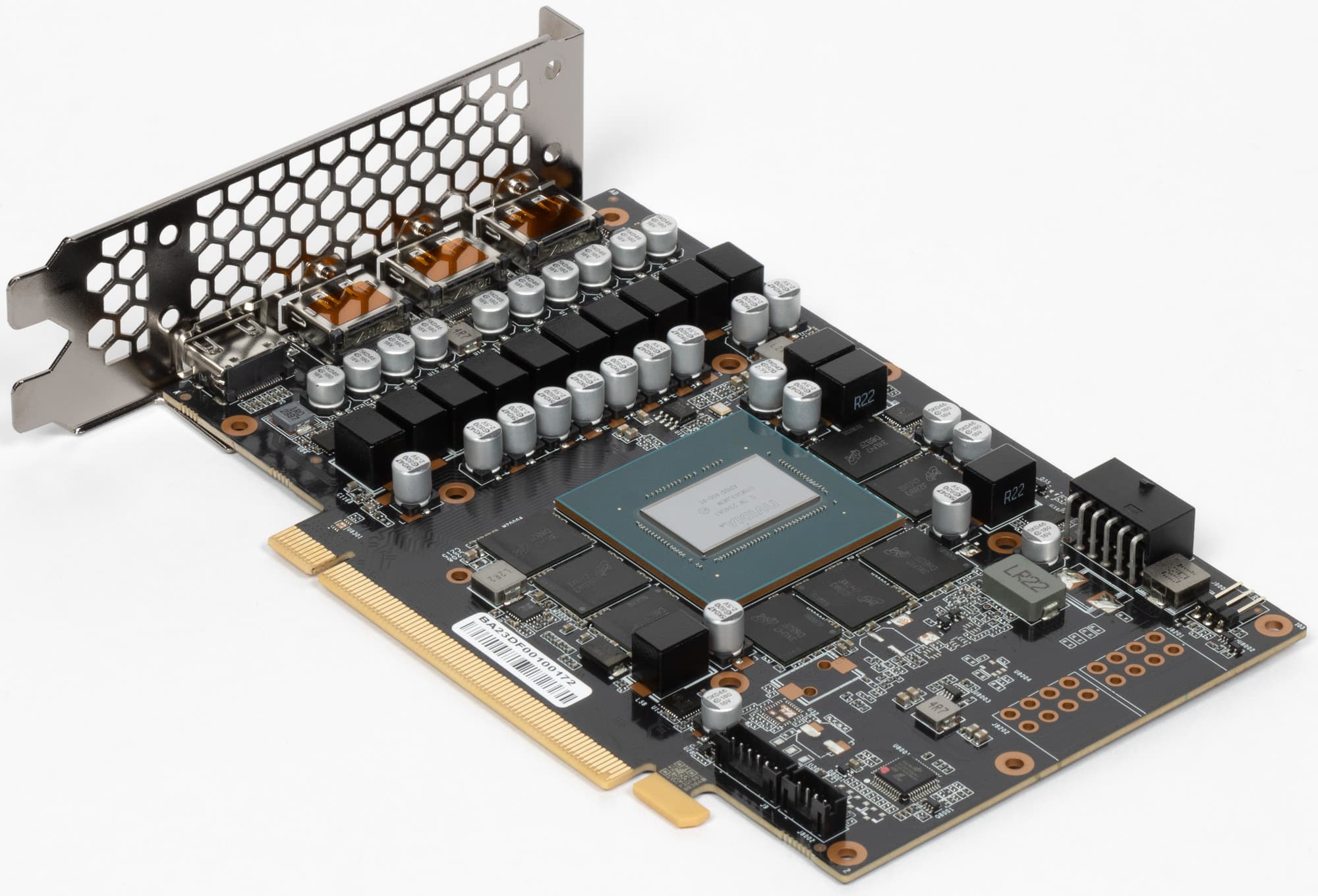 Сбоку справа на карте мы видим посадочные места, похожие на те, что используются для 8-контактных разъемов питания. На самом деле они предназначены для подключения мощных внешних вентиляторов в системах, использующих профессиональные версии подобных видеокарт (для игровых и профессиональных видеокарт используются одни и те же GPU, разница может быть лишь в объеме памяти, конфигурации рабочих блоков и, конечно же, в программном обеспечении).