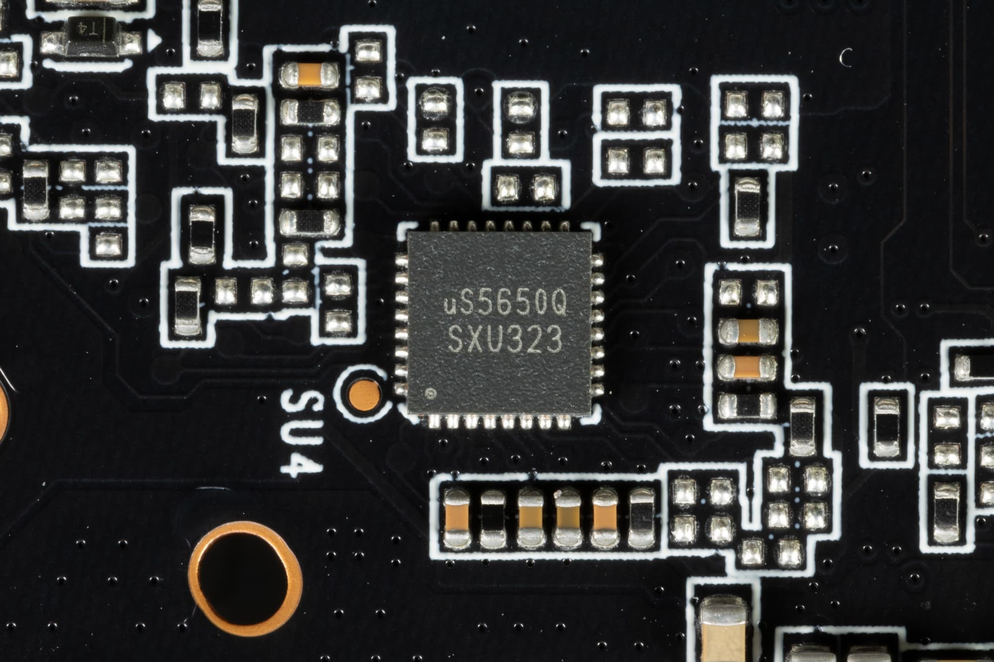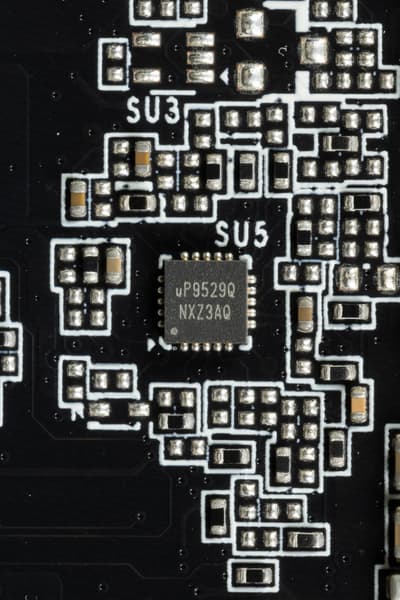 Также на тыльной стороне платы имеется контроллер uP5650Q (uPI Semi), который отвечает за мониторинг карты (отслеживание напряжений и температуры).