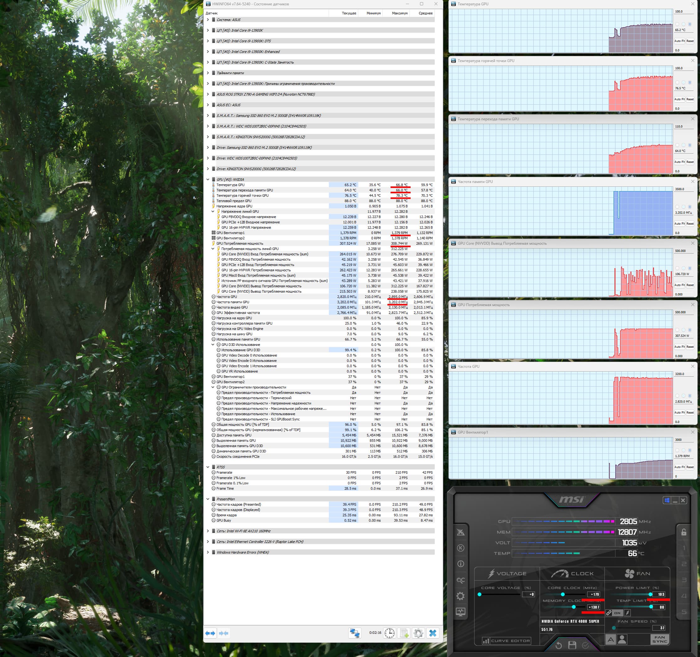 Лимита энергопотребления у данной карты можно поднять до 103%. Я попробовал ручной разгон (подняв лимит потребления до предела) и получил максимальные частоты 2895/25616 МГц, что обеспечило прирост в играх в разрешении 4K в среднем почти на 4% относительно референсных значений. Энергопотребление карты выросло до 309 Вт (в пике 312 Вт).