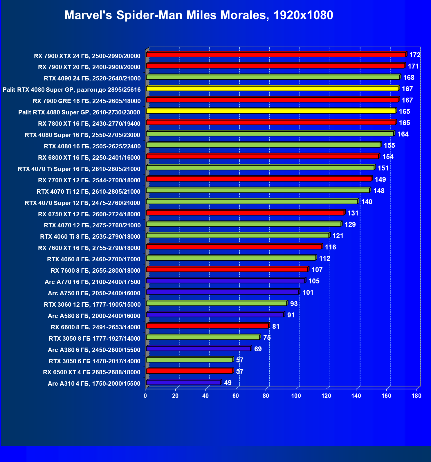 | 07 | RX 7900 XT 20 ГБ, 2400—2900/20000 | 2365 | 249 | 95 000 |