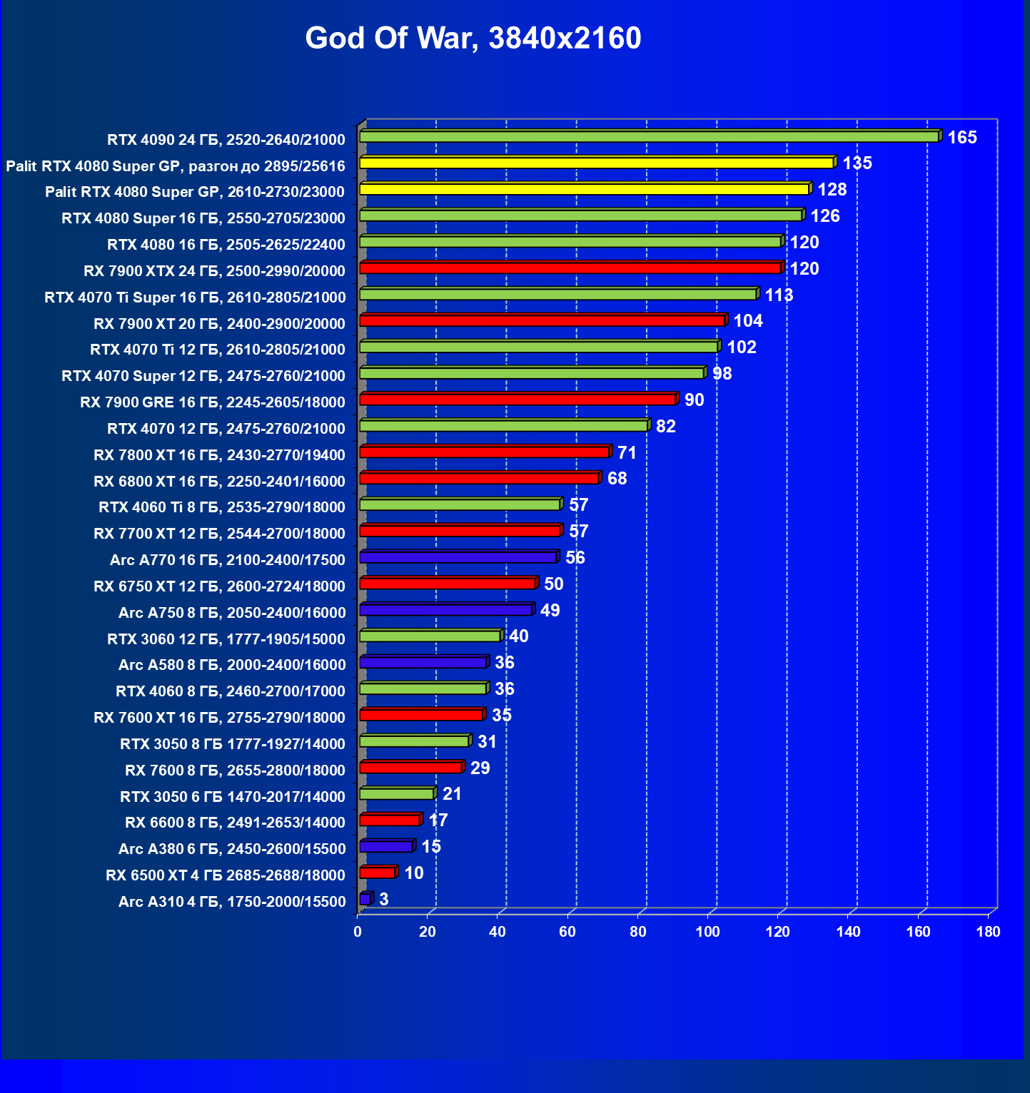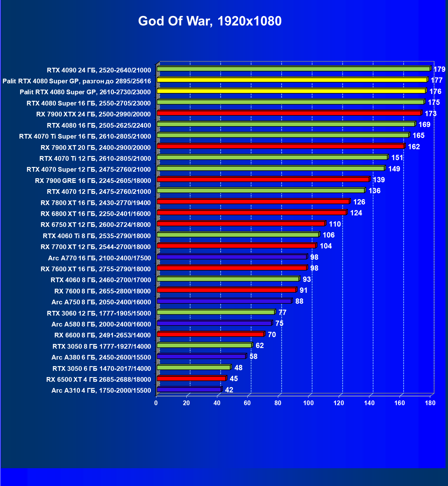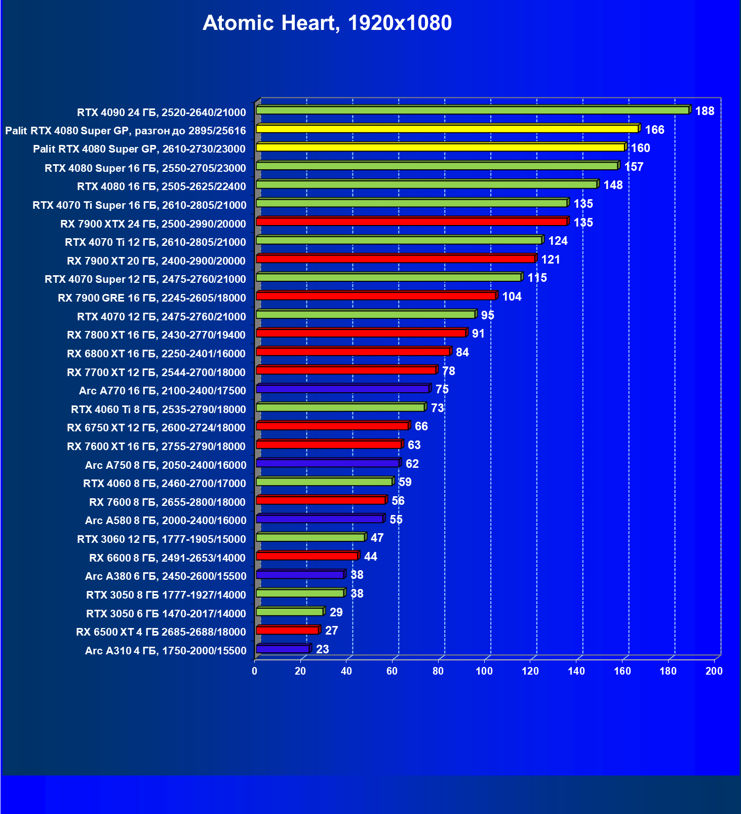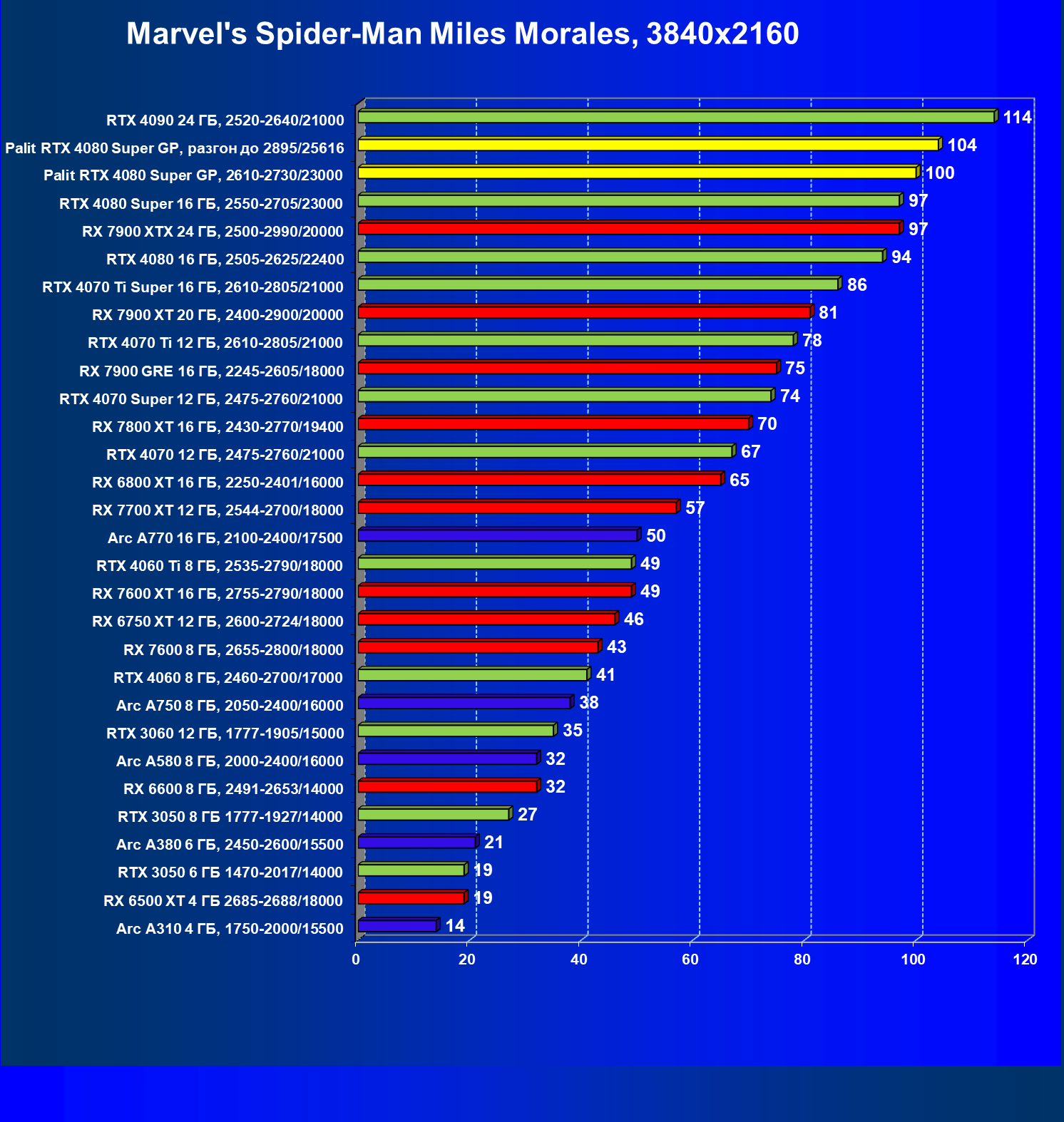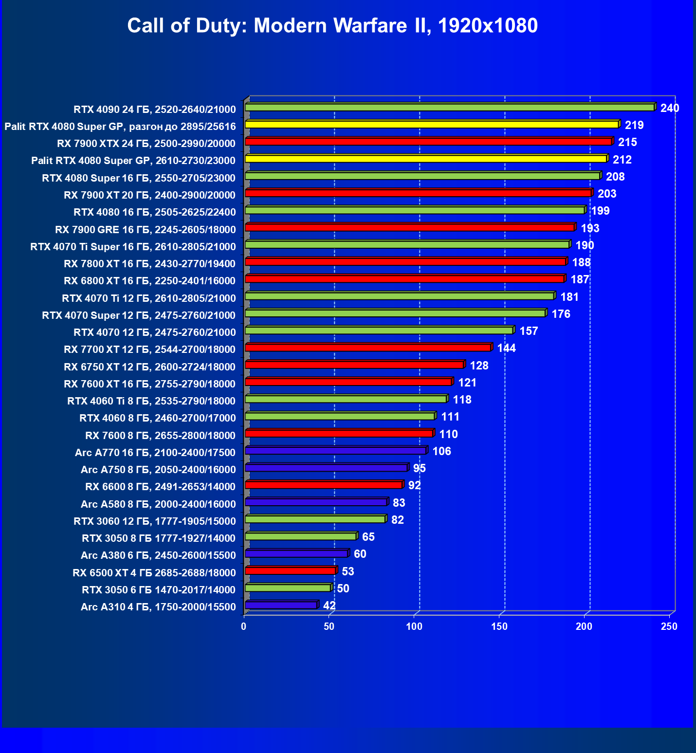 | 21 | Palit RTX 4080 Super GP, 2610—2730/23000 | 240 | 2879 | 120 000 |