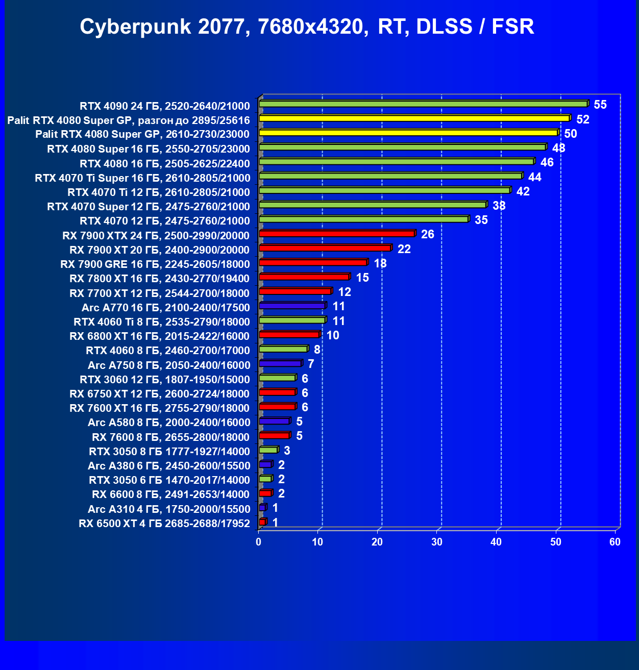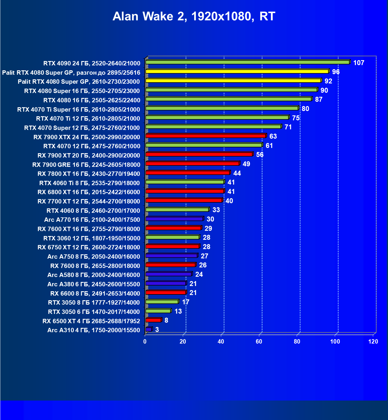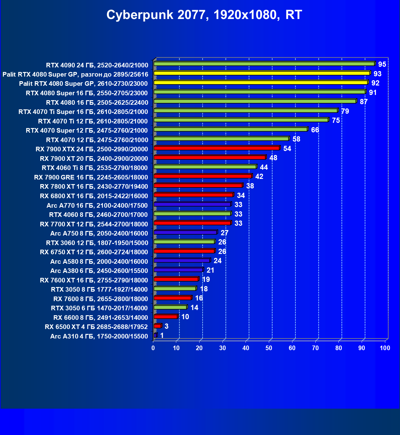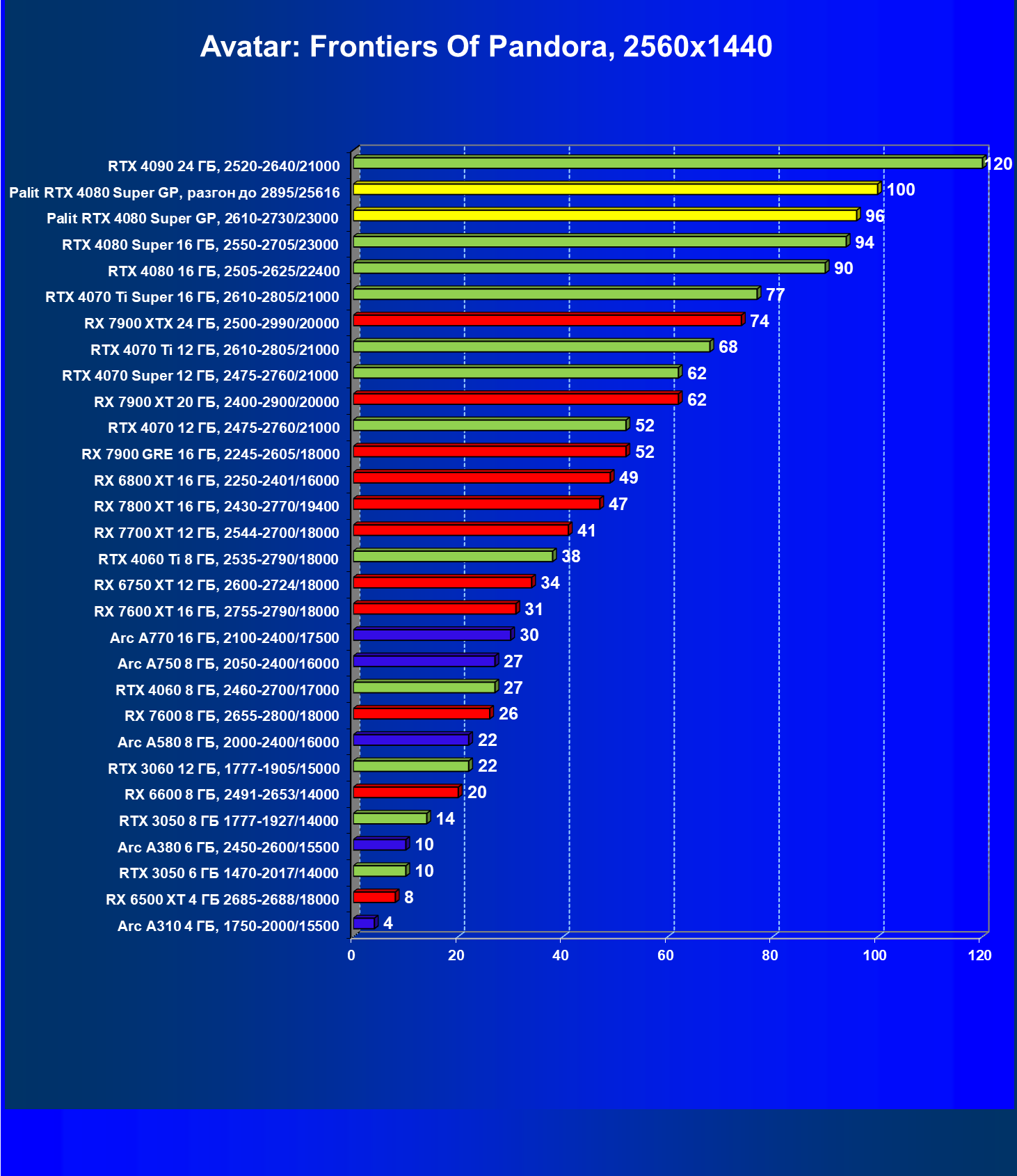 | 03 | Palit RTX 4080 Super GP, 2610—2730/23000 | 5230 | 436 | 120 000 |