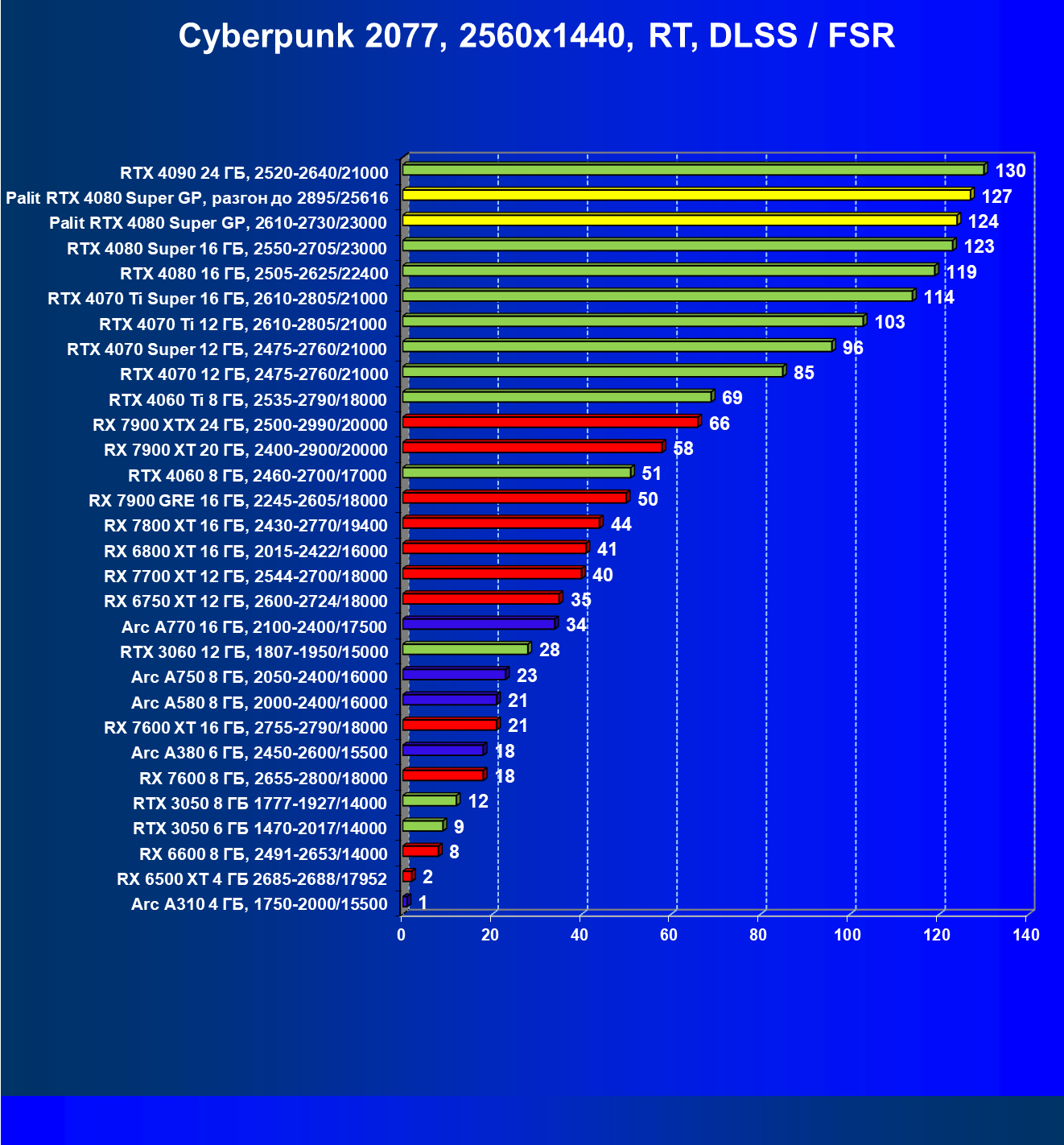 Более дешевые карты Radeon RX 7900 XT/XTX в этом рейтинге выше, и лишь разогнанная карта Palit, да еще если считать ее цену по минимуму, может составить им достойную конкуренцию.