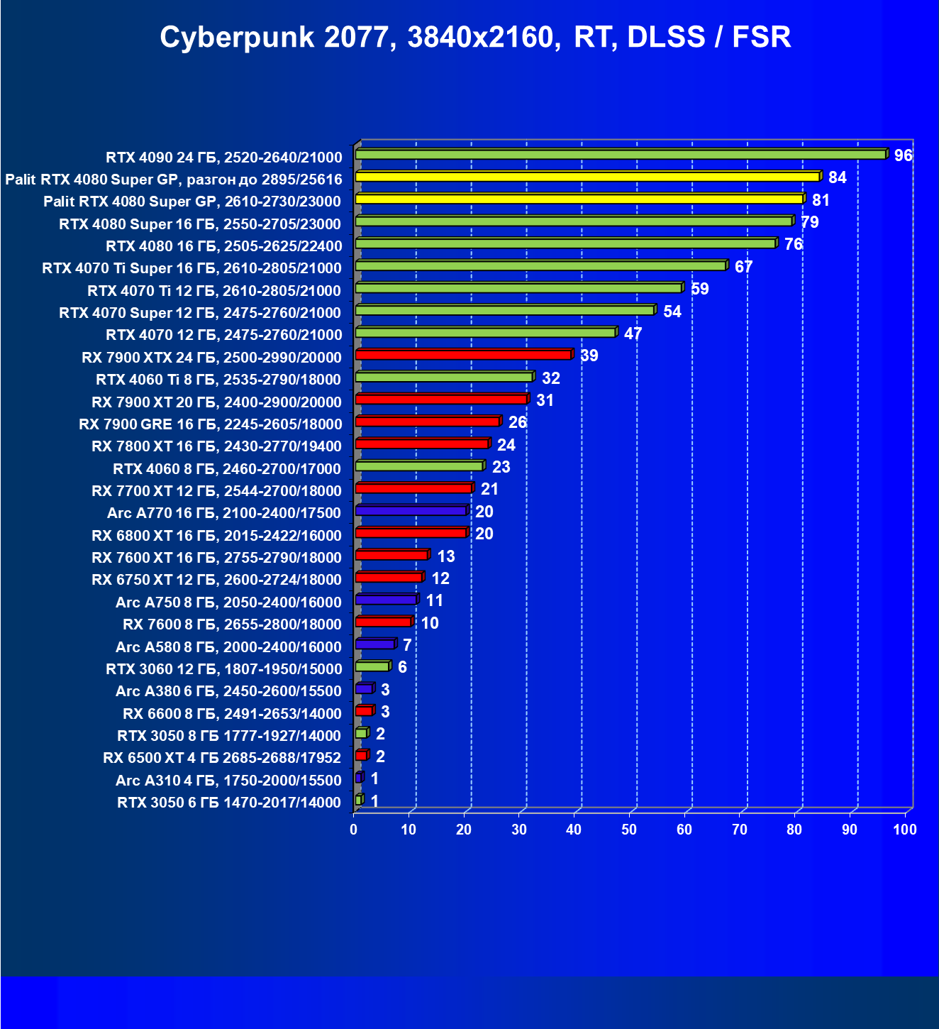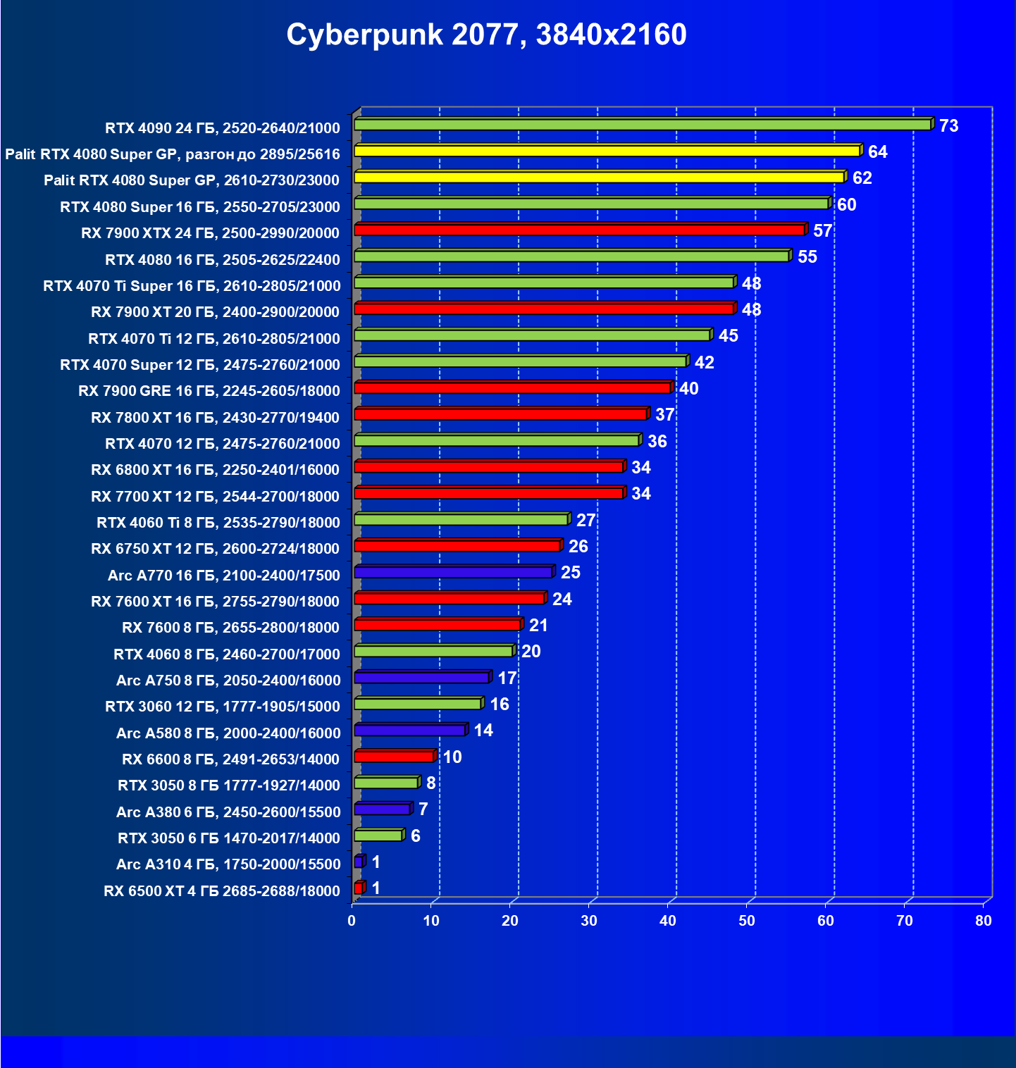 | 03 | Palit RTX 4080 Super GP, 2610—2730/23000 | 2879 | 240 | 120 000 |