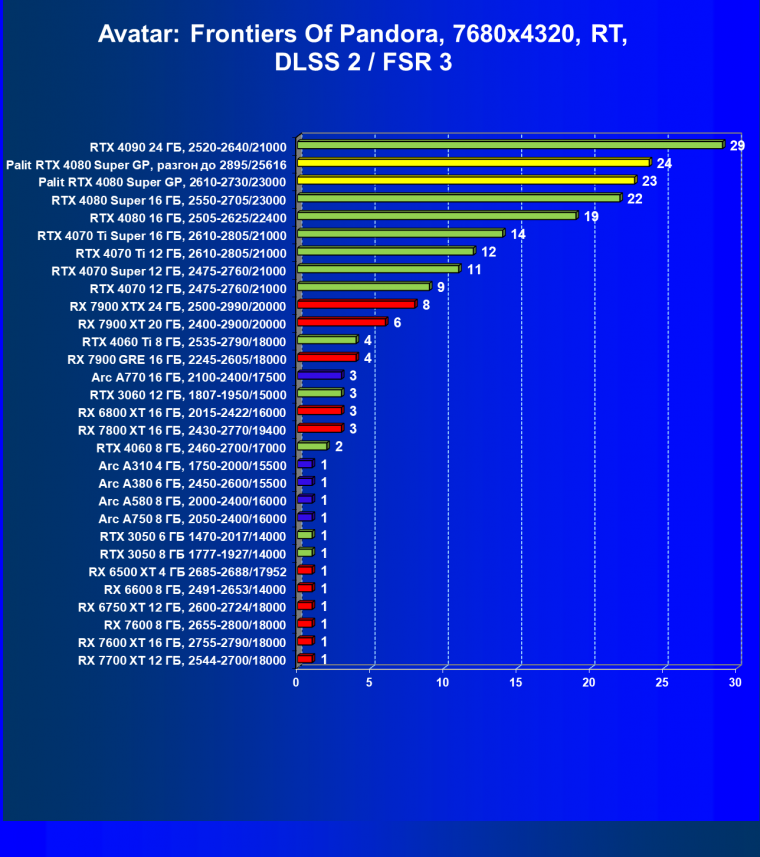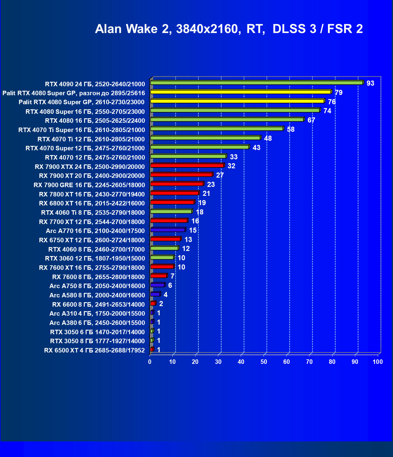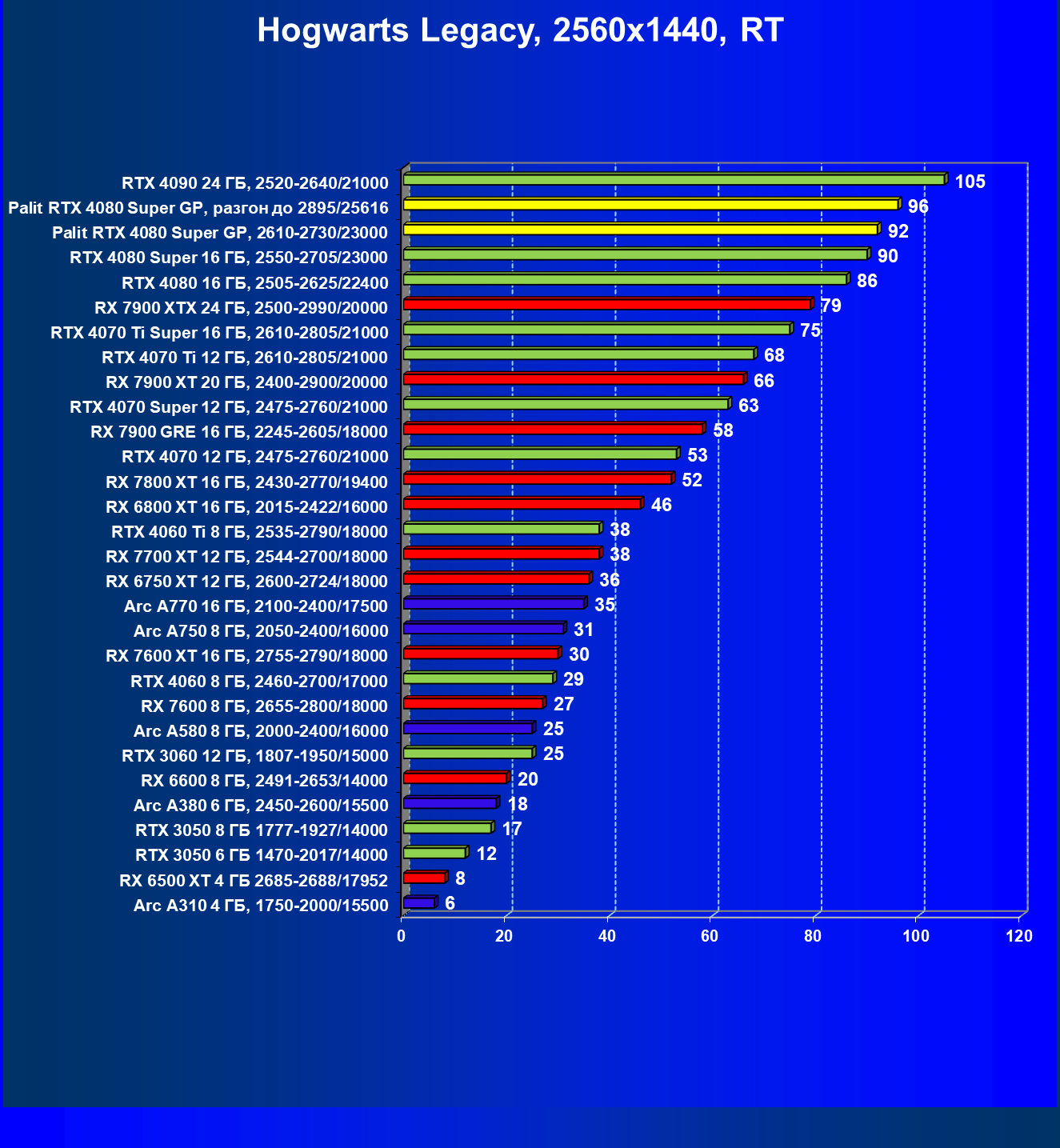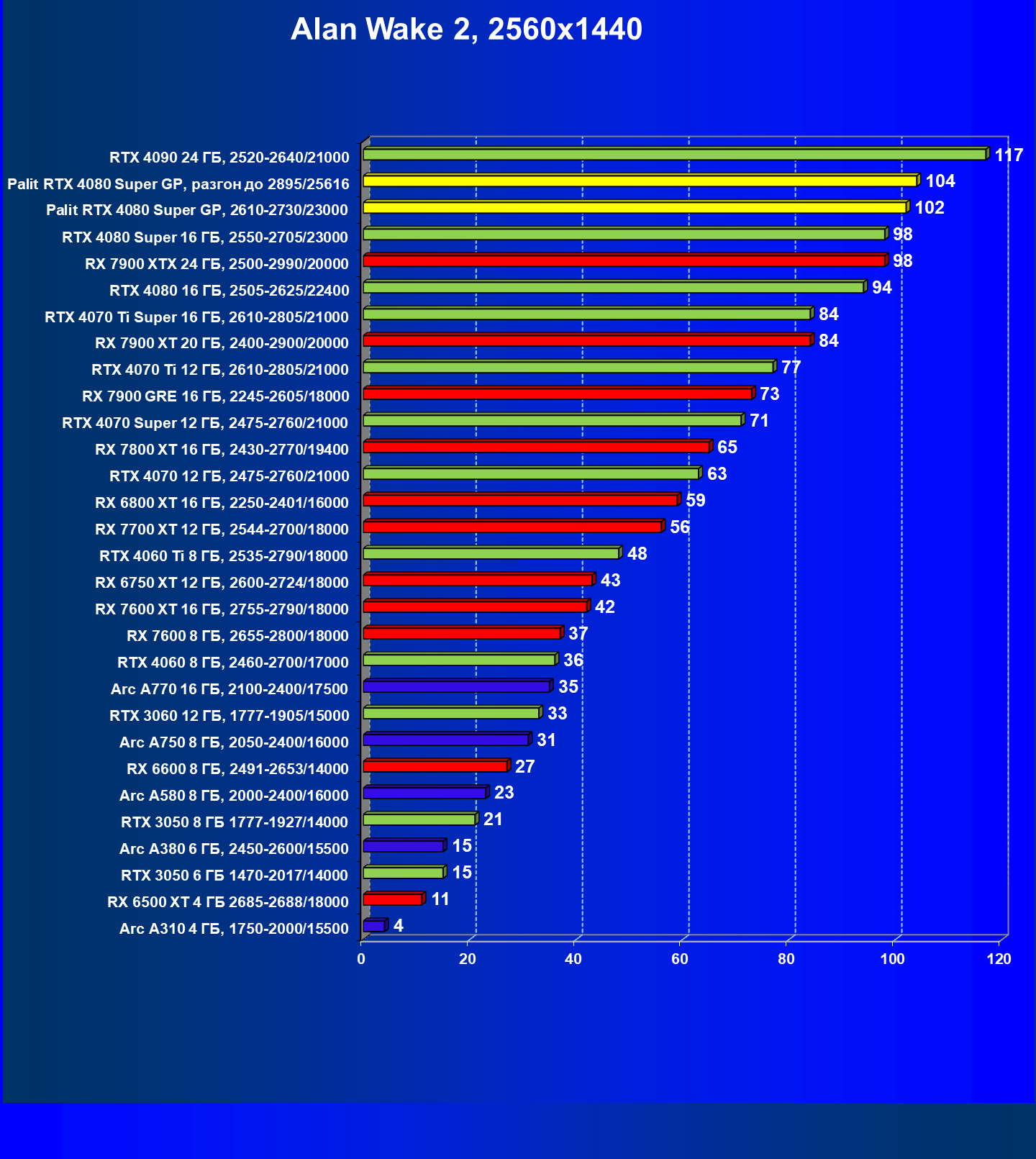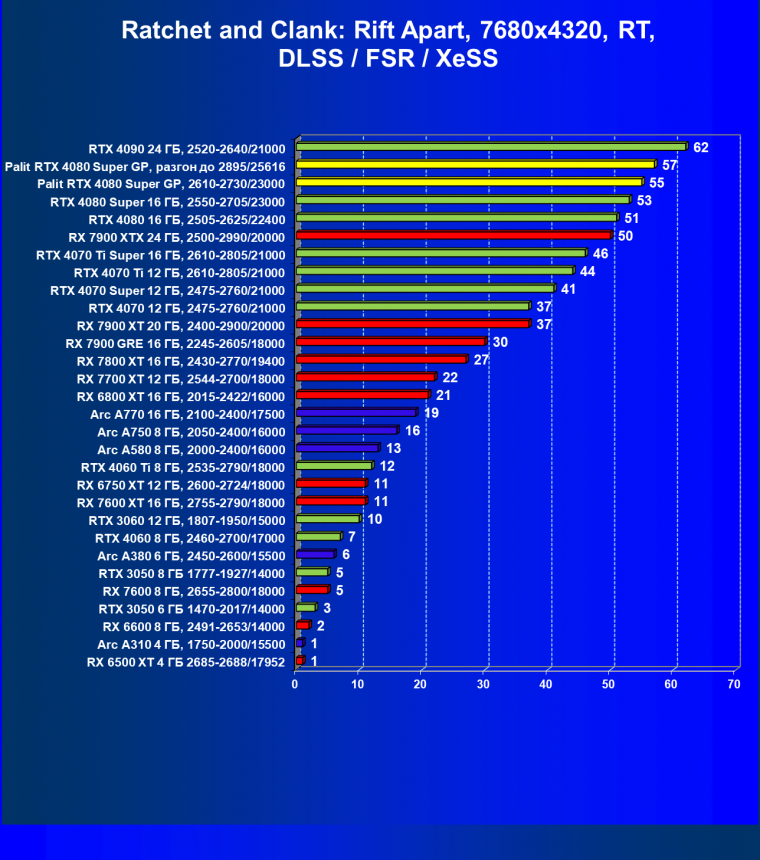 | 17 | Palit RTX 4080 Super GP, разгон до 2895/25616 | 249 | 2990 | 120 000 |