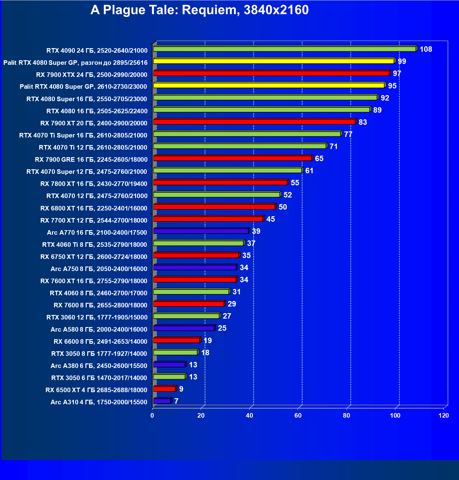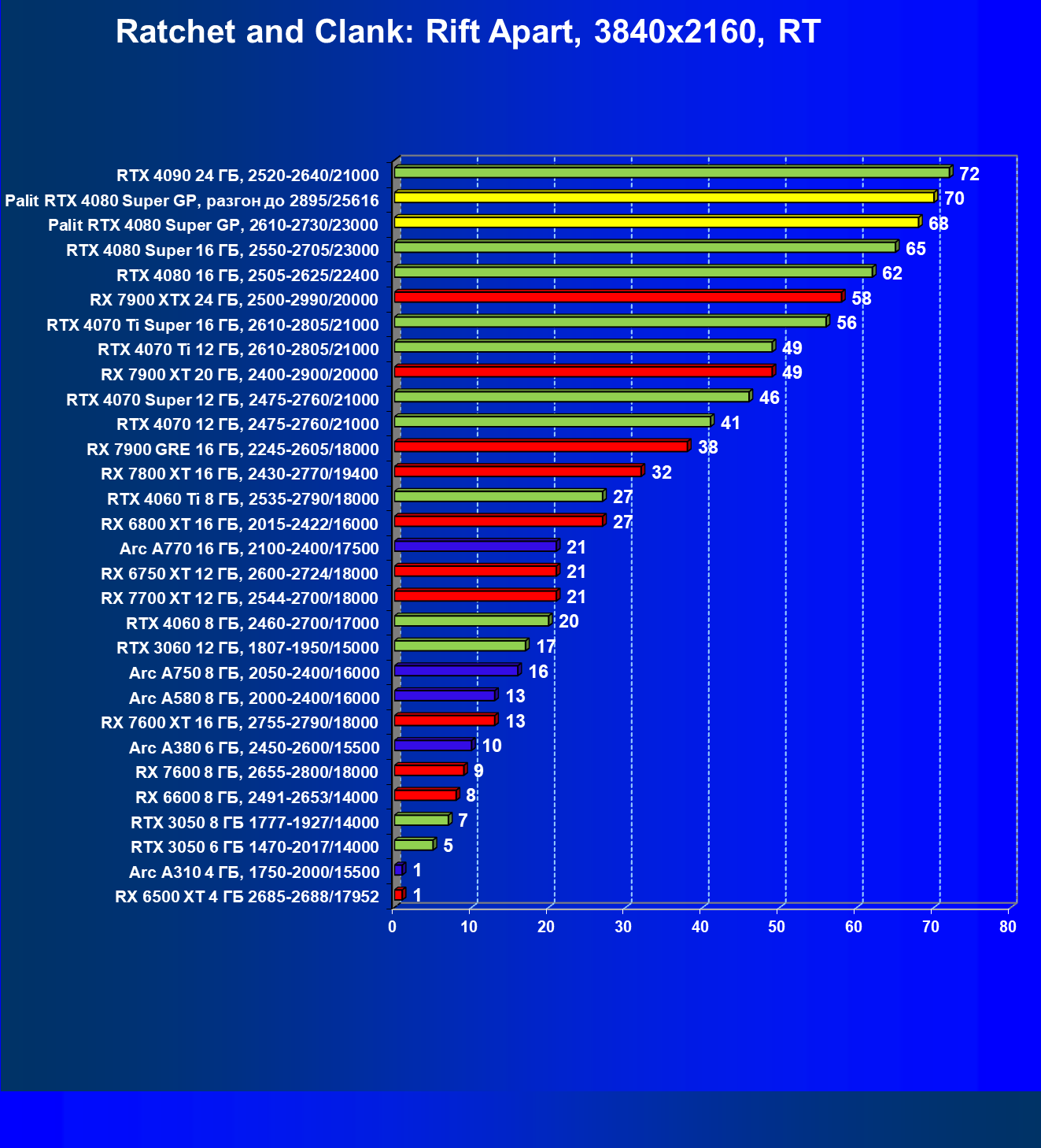 Учитывая нацеленность GeForce RTX 4080 Super на разрешение 4К, мы привели рейтинг, подсчитанный только при использовании разрешения 3840×2160.