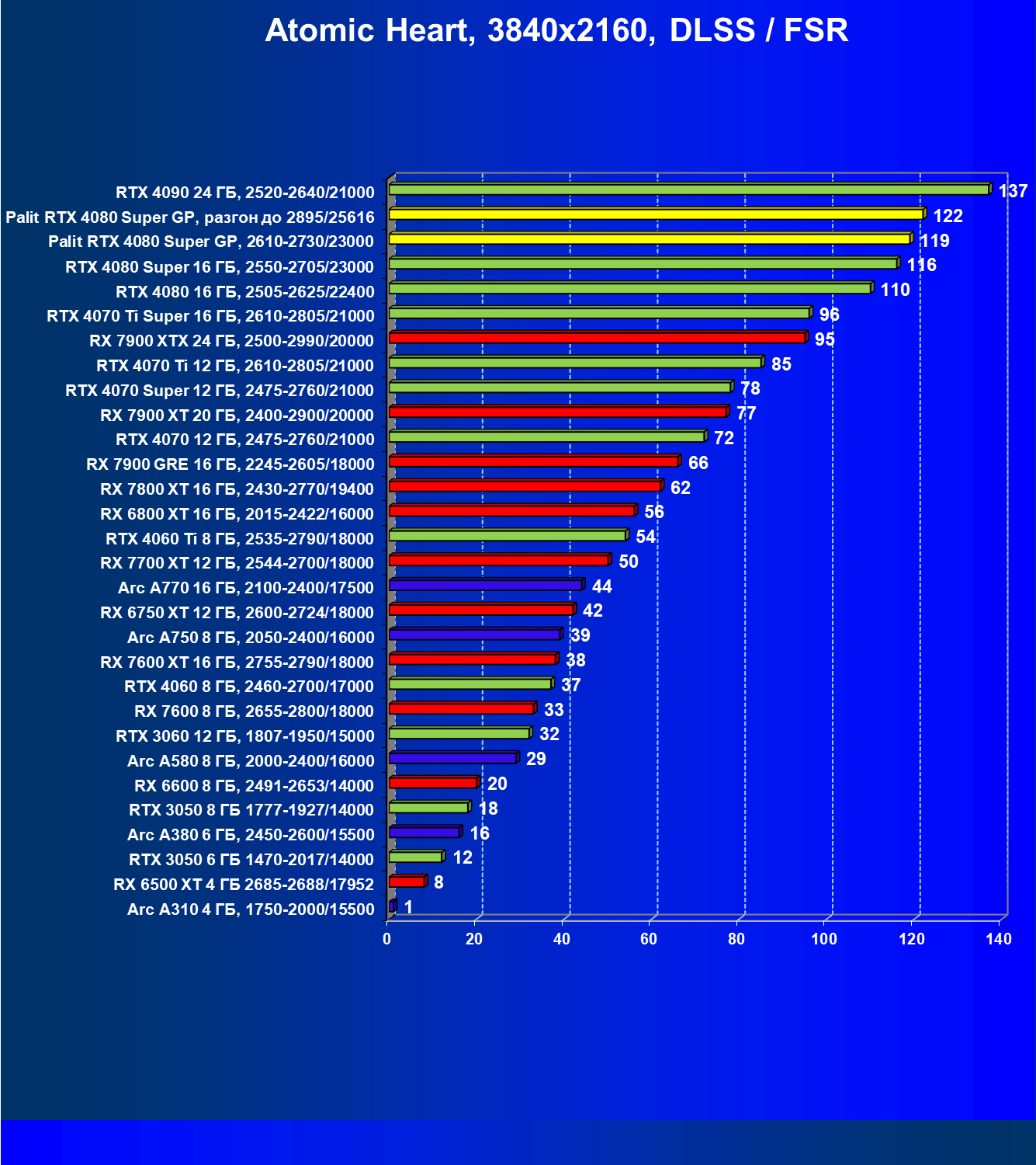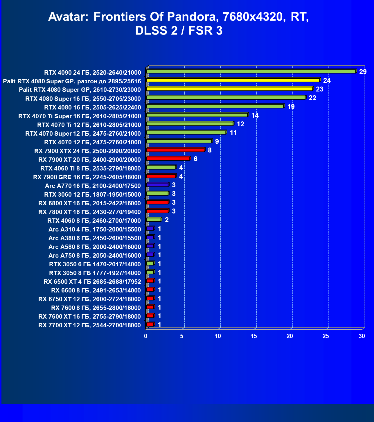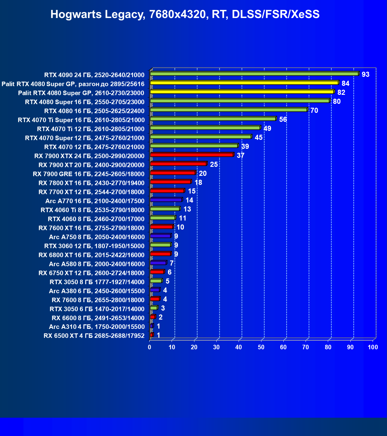 | 17 | RX 7900 XT 20 ГБ, 2400—2900/20000 | 306 | 2908 | 95 000 |
