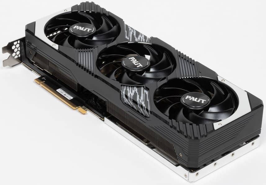 Карта Palit способна потреблять до 302 Вт. Система охлаждения мощная, высокоэффективная и тихая. Разгон из-за ограничения потребления особого выигрыша не приносит. Габариты этой модели составляют 33 см в длину и 13 см в высоту, а по толщине видеокарта занимает 4 слота в корпусе. Набор видеовыходов стандартный: 3 DP и 1 HDMI.