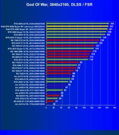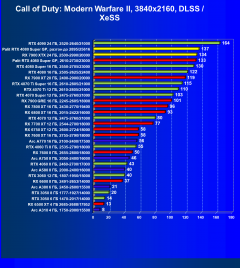 Рейтинг составлен по 9 тестам, в которых используется технология трассировки лучей и одновременно технология Nvidia DLSS, AMD FSR или Intel XeSS. Этот рейтинг нормирован по самому слабому ускорителю — Arc A310 (то есть сочетание скорости и функций Arc A310 приняты за 100%).