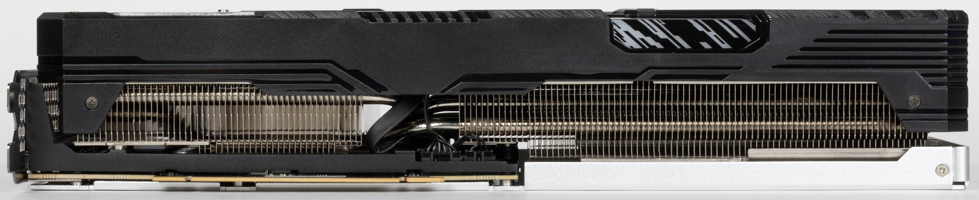 Трубки припаяны к большой медной никелированной пластине, которая охлаждает как ядро, так и микросхемы памяти (через термопрокладки). А для охлаждения преобразователей питания VRM имеется своя подошва на массивной раме, прикрученной к радиатору (рама также служит элементом жесткости всей конструкции).