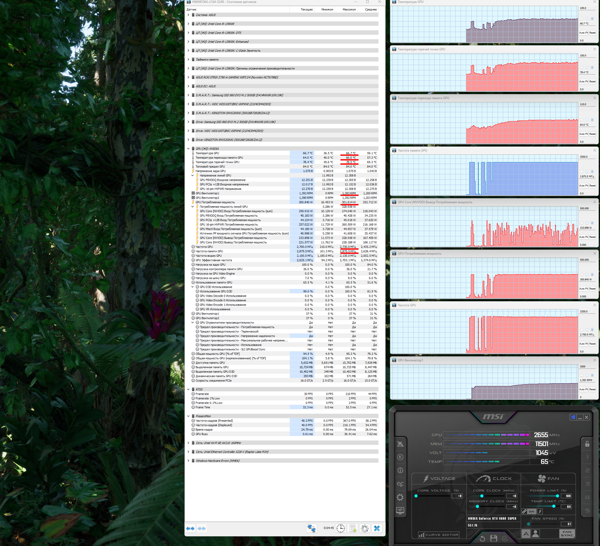 При ручном разгоне параметры нагрева и шума практически не менялись (67/78/66 °C), максимальное потребление выросло до 309 Вт (до 312 Вт в пике).