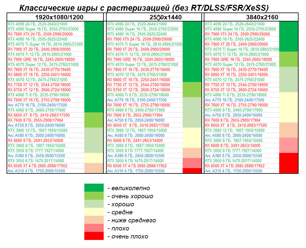 Разумеется, как только в играх активизировали трассировку лучей, даже топовые видеокарты AMD существенно падают в рейтинге. И поскольку вскоре, похоже, львиная доля 3D-игр по умолчанию будет поддерживать и RT, и DLSS/FSR/XeSS, данный рейтинг более показателен для тех, кто покупает дорогую видеокарту на приличную перспективу.
