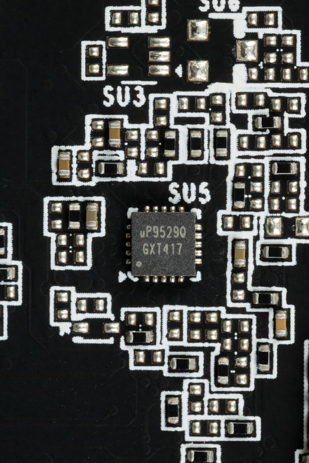 Также на тыльной стороне платы имеется контроллер uP5650Q (uPI Semi), который отвечает за мониторинг карты (отслеживание напряжений и температуры).