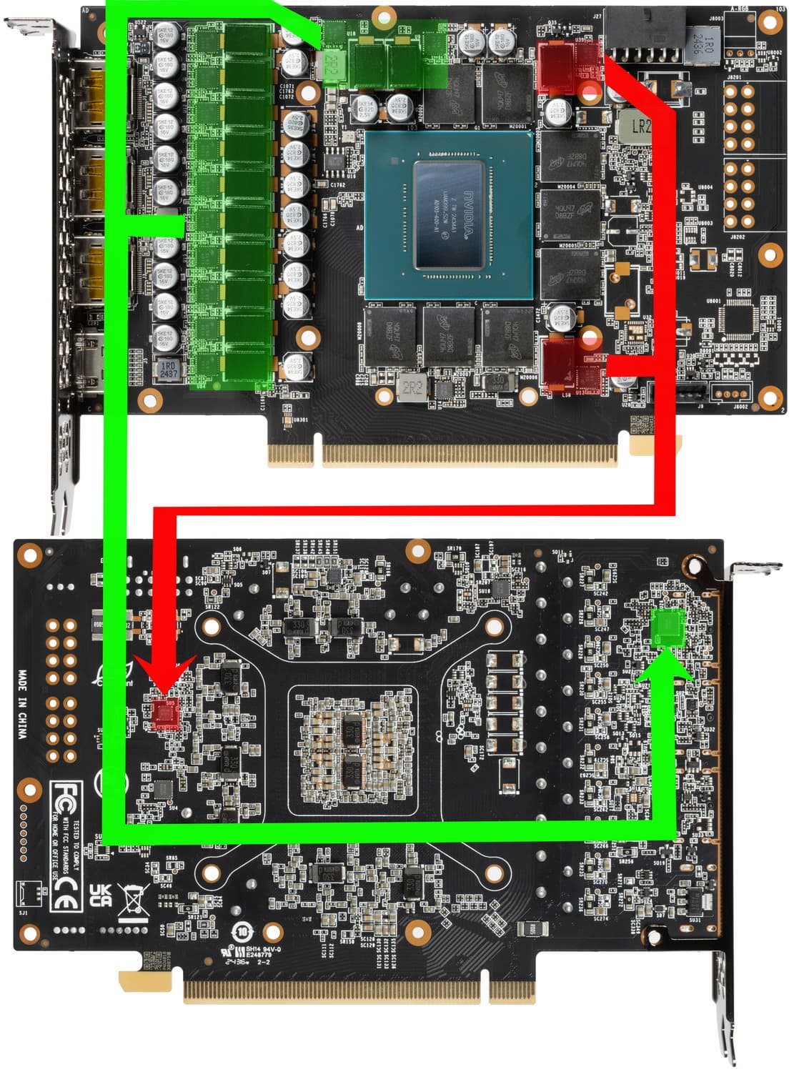 Зеленым цветом отмечена схема питания ядра, красным — памяти. Все ШИМ-контроллеры расположены на оборотной стороне PCB.