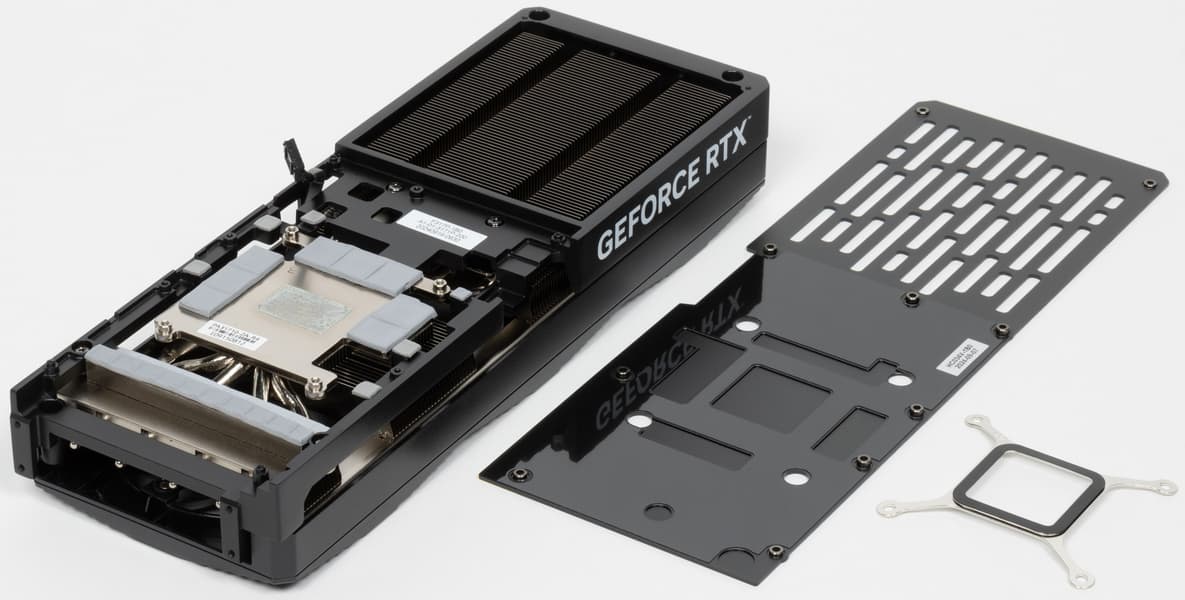 Трубки припаяны к большой медной никелированной пластине, которая охлаждает как ядро, так и микросхемы памяти (через термопрокладки). А для охлаждения преобразователей питания VRM имеется свой теплосъемник на массивной раме, прикрученной к радиатору (рама служит также элементом жесткости всей конструкции).