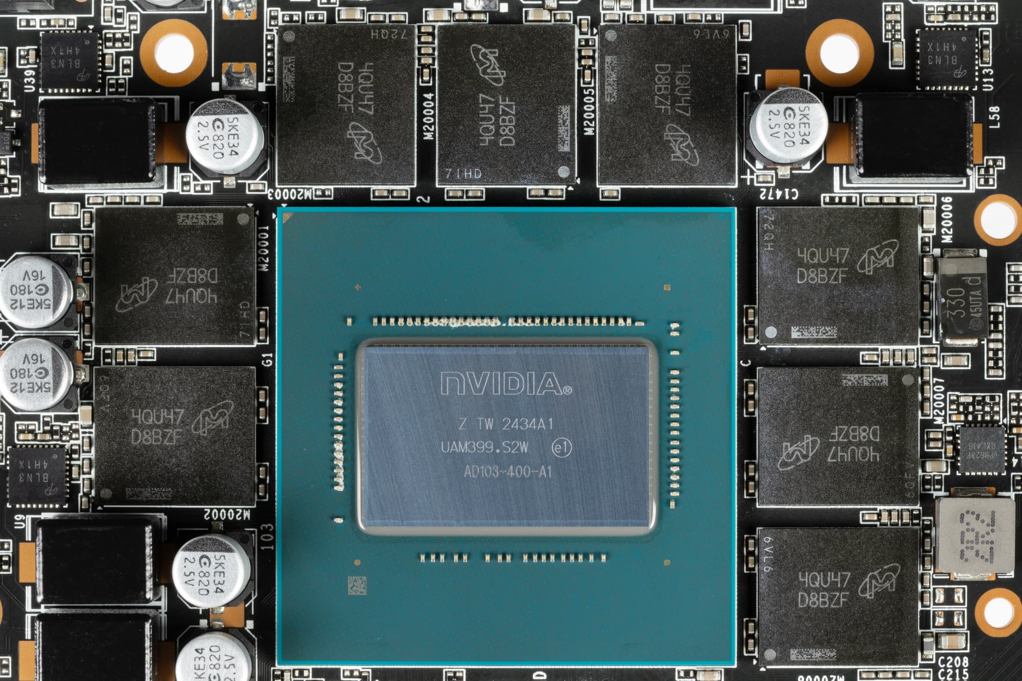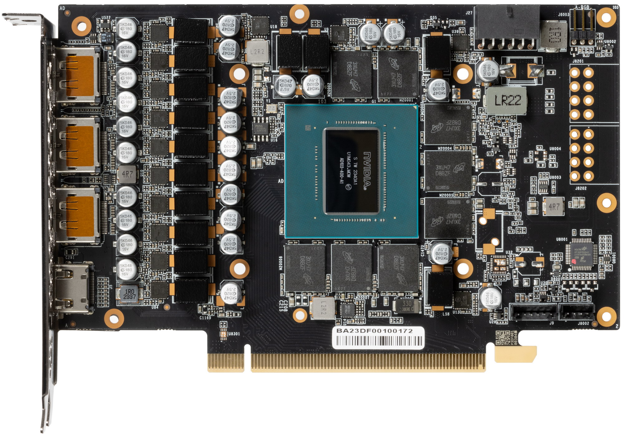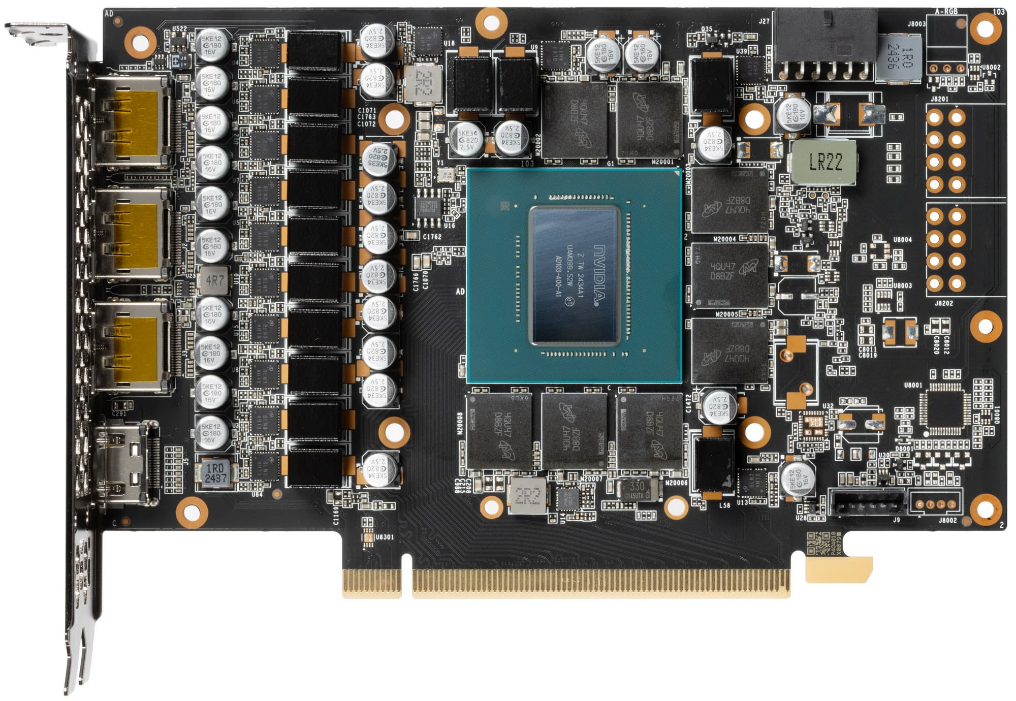 Карта имеет 16 ГБ памяти GDDR6X SDRAM, размещенной в 8 микросхемах по 16 Гбит на лицевой стороне PCB. Микросхемы памяти Micron (MT61K512M32KPA-24 / D8BZF) рассчитаны на номинальную частоту работы в 3000 (24000) МГц.