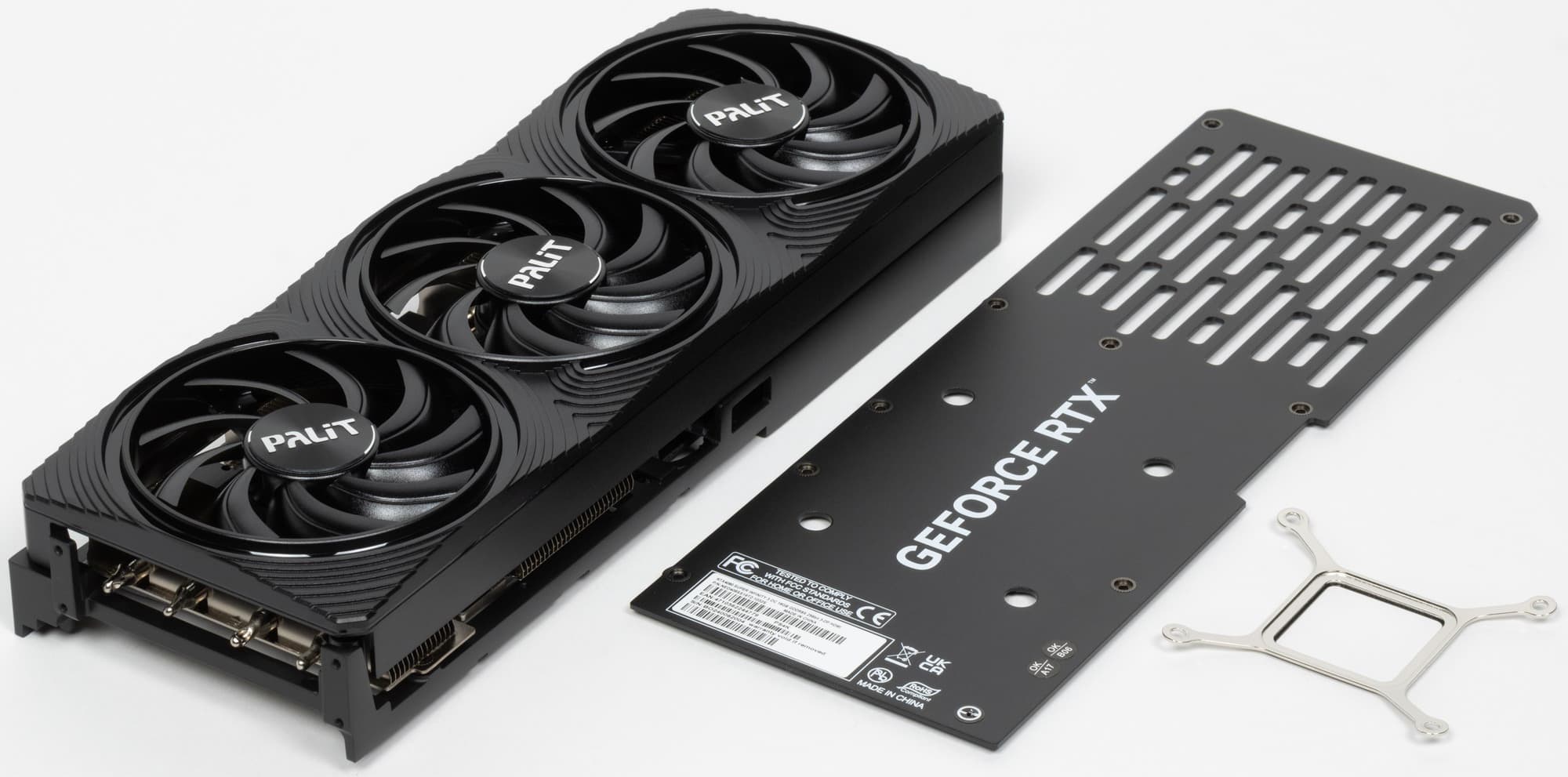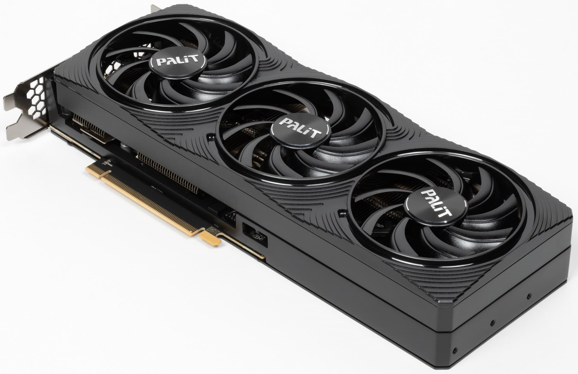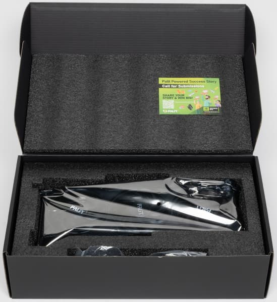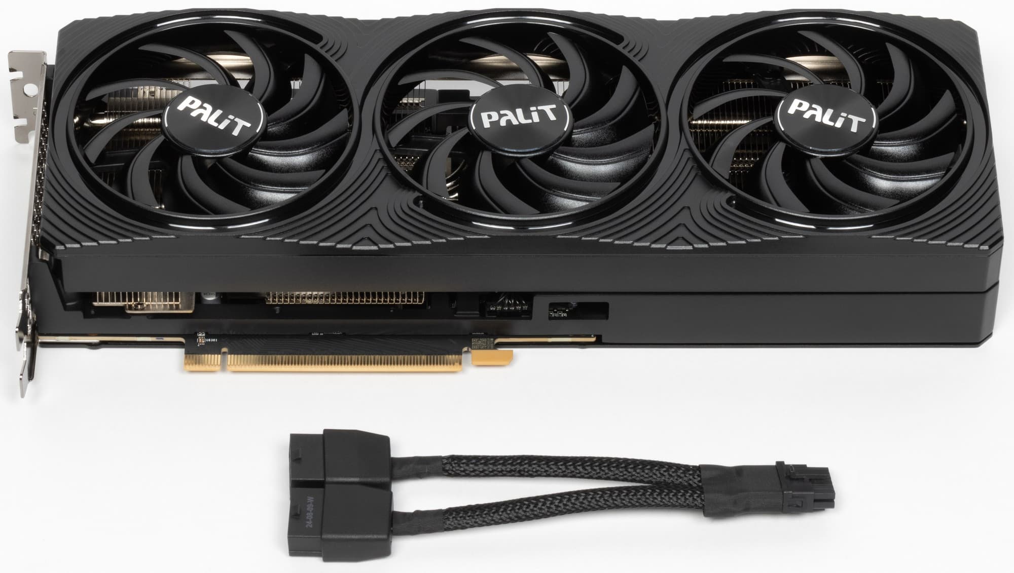 Карта Palit имеет 16-контактный разъем питания версии PCIe 5.0. Хотя в комплекте поставки имеется адаптер-переходник для подключения разъемов питания типа PCIe 2.0 (для 3 таких разъемов), лучше всё же использовать блоки питания стандарта ATX 3.0 с полноценной поддержкой питания PCIe 5.0 (с кабелем 12VHPWR). Напомню, что карта не оснащена подсветкой.