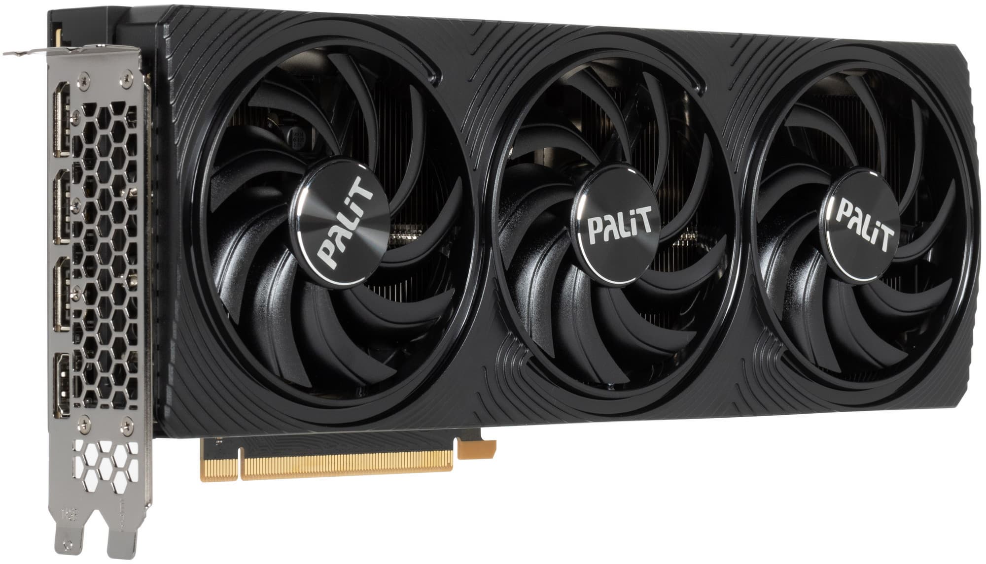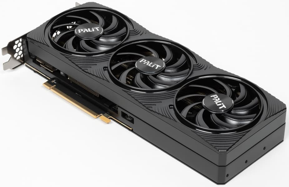 Карта Palit способна потреблять до 309 Вт (до 350 Вт в пике). Система охлаждения в принципе достаточно эффективная, но и температуры, и шум под нагрузкой выше, чем у более крупных аналогов. Стоит ли такая расплата уменьшенных габаритов (29 см в длину, 11 см в высоту, 5 см в толщину) — решать вам. Набор видеовыходов — 3 DP 1.4a и 2 HDMI 2.1.
